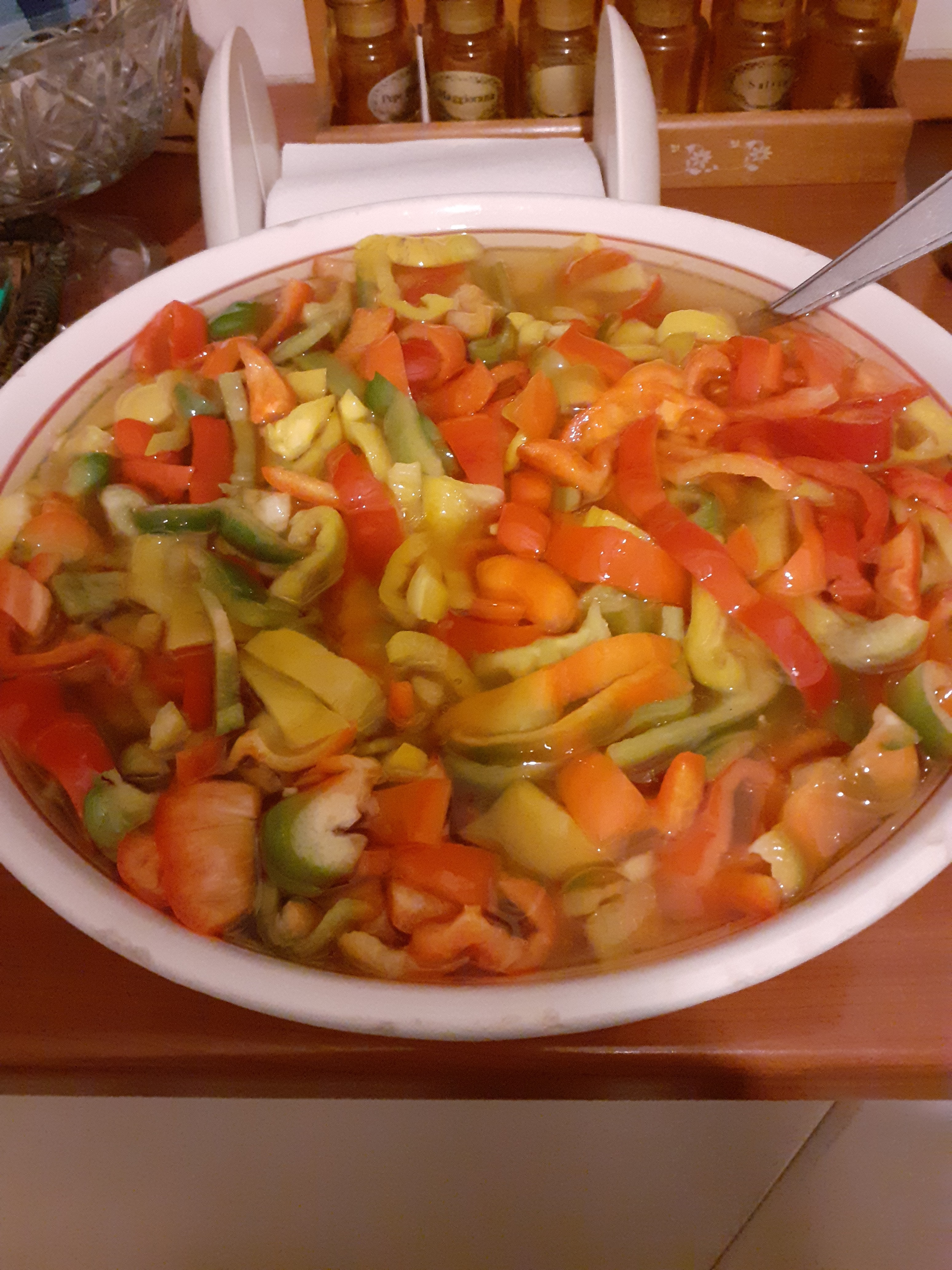 grazie a tutte per l ' aiuto....sistemato i peperoni....ho fatto tanta peperonata ( pronta da congelare ) ....poi alcuni , i più belli "non ho resistito " e li ho fatti in agrodolce ( peccato che erano solo verdi ) ...alcuni messi a pezzi in frizer....e anche alcuni ripieni ( visto che alla mia nuora piacciono tanto
