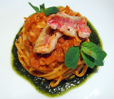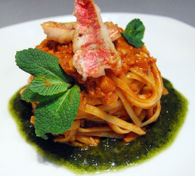 Stufare gli ortaggi, aggiungere le triglie aumentando la fiamma, sfumare, aggiungere il concentrato di pomodoro e la salsa, poi la menta, il fumetto, la paprika e lasciar cuocere per 40 minuti circa. Se il sugo dovesse asciugarsi, aggiungete fumetto.