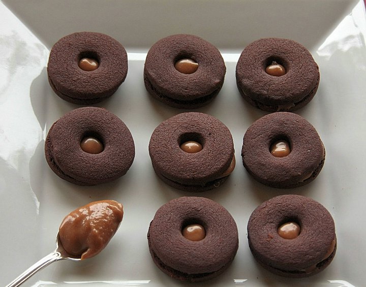Preriscaldare il forno a 200 gr,coprire delle placche di carta da forno,tagliare con l'oggetto adatto i biscotti e cuocerli 10 minuti.Lasciarli raffreddare sulla placca,farcirli.