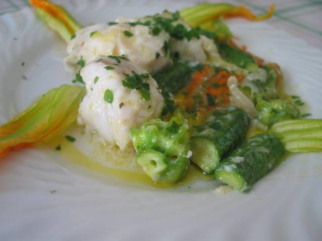 Un secondo piatto leggero e profumato, perfetto per la primavera: rana pescatrice morbida e delicata accompagnata da zucchine croccanti e i loro fiori.