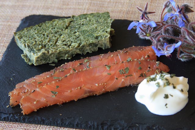 "pain" di borragine,salmone marinato,formaggio fresco,un delizioso antipasto
