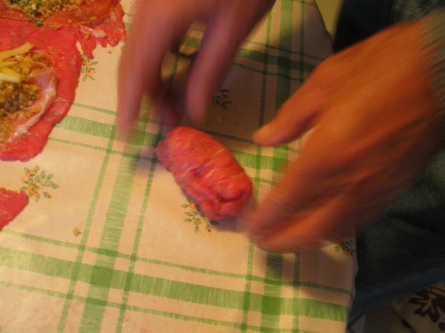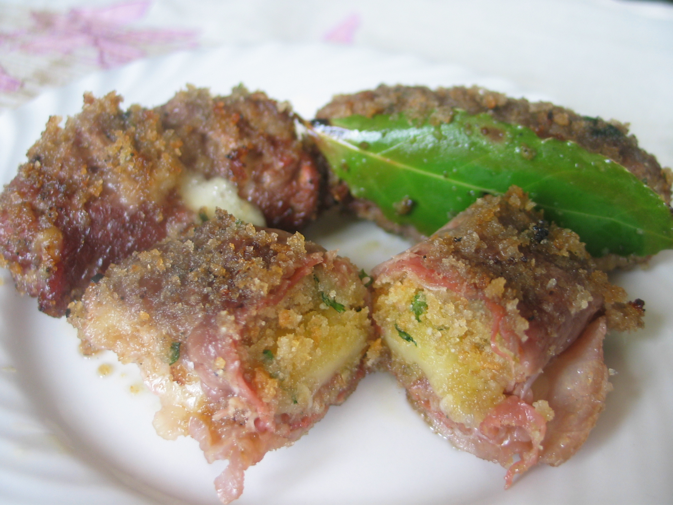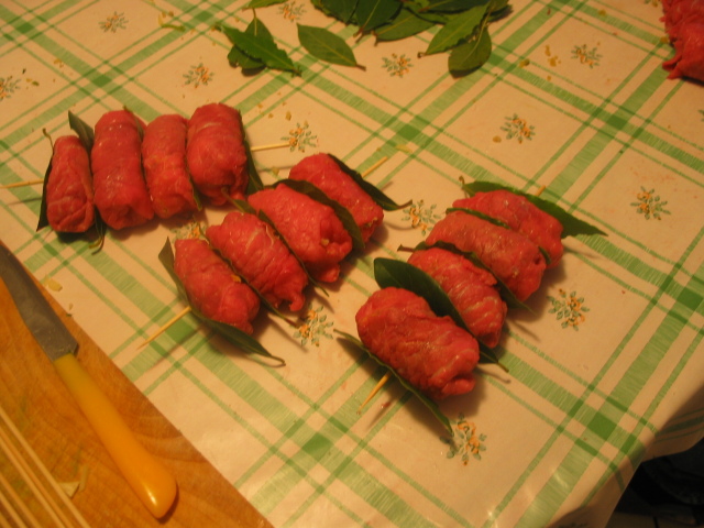 Noi usiamo fettine di girello di vitellone. Ogni fettina va leggermente spalmata di strutto e farcita con pangrattato grossolano, olio, sale, pepe, prezzemolo e un po’ di parmigiano.