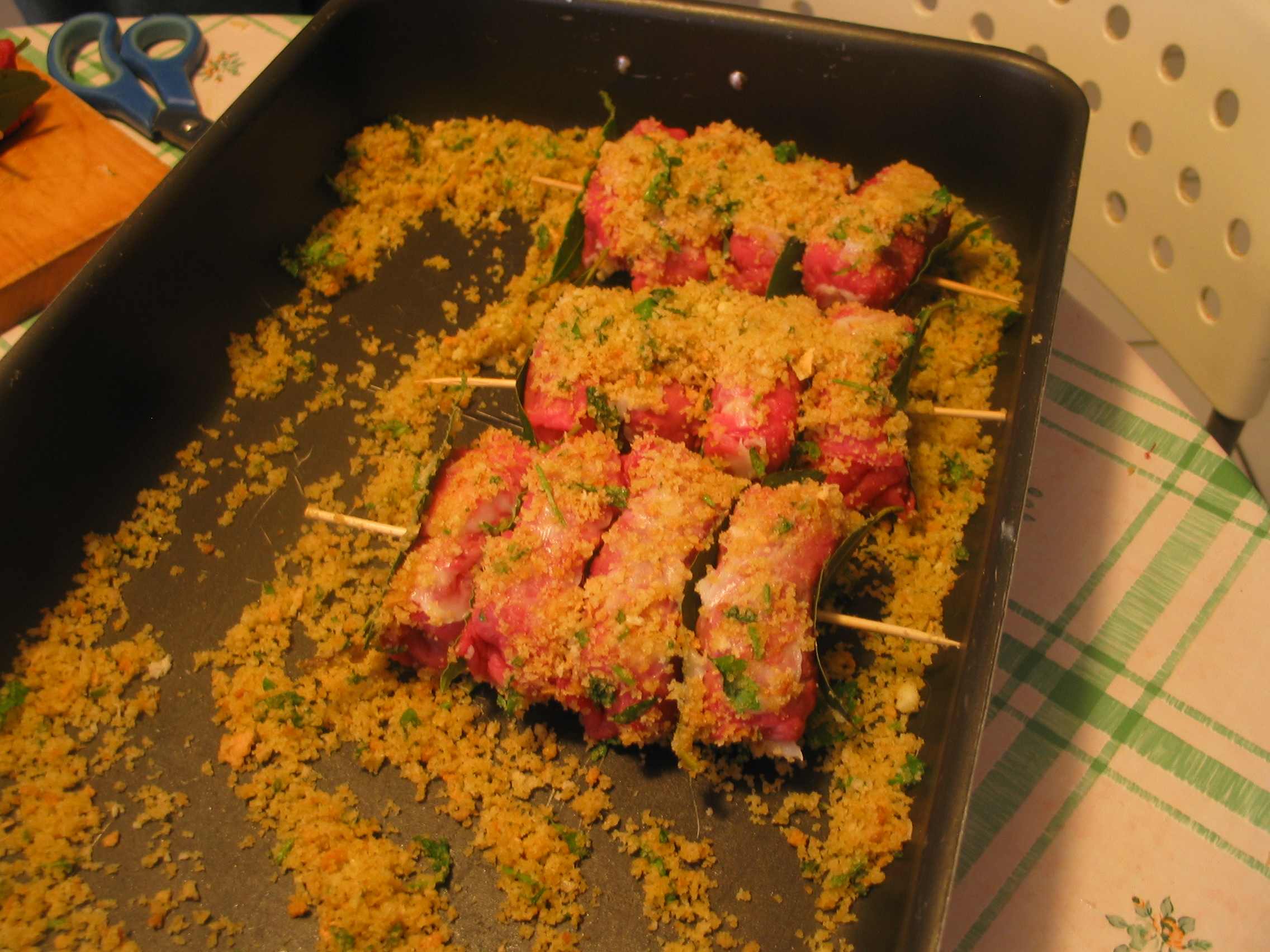 Gli spiedini preparati vanno ancora leggermente unti di strutto e passati nella mollica di pane condita.