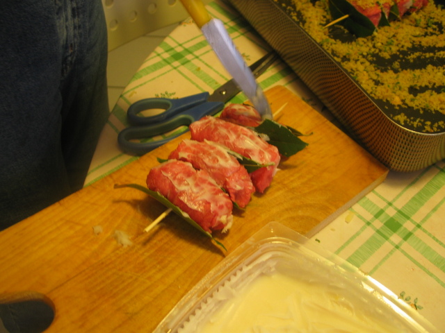 Bisogna poi chiudere le fettine a bauletto e infilzarle negli spiedini come da foto... tra l’una e l’altra una foglia di alloro (come da me suggerito), ma ci sta benissimo anche una foglia di cipolla.