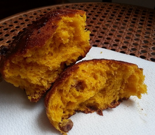 Mescolare il lievito disidratato (o quello fresco) con la farina e cominciare l'impasto unendo tutto il passato di zucca, lo zucchero e gli aromi. Unire pian piano le uova battute con il sale e quando l'impasto si è quasi formato, aggiungere a poco a poco il burro morbido. Lavorare a lungo l'impasto in modo che diventi soffice e morbido, ma non molle e che si stacchi dal piano di lavoro o dalla ciotola dell'impastatrice. Nel caso aggiungere un po' di farina.
