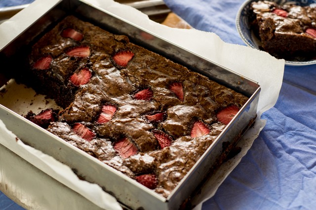 Sono i suoi brownies al cioccolato a cui ho aggiunto solo un po' di fragole. Facile e veloci, secondo me con una punta acidula come i lamponi o le fragole stanno benissimo!