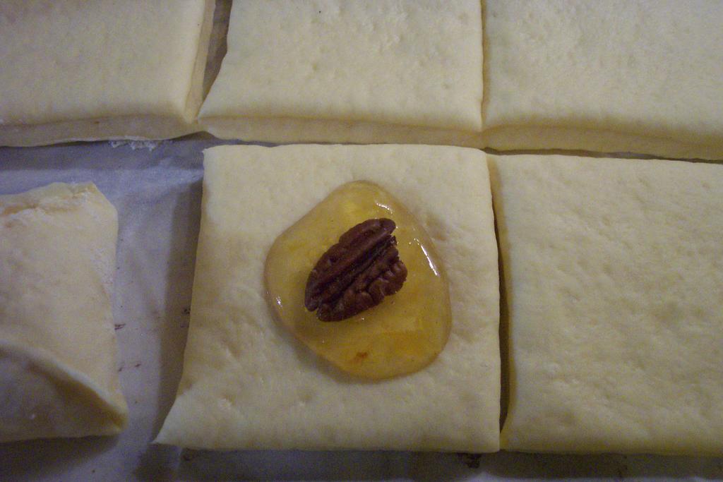 Sciogliere il lievito ed il miele in 100 ml di latte preso dal totale ed intiepidito; mescolare bene con 100 g di farina presa dal totale. Coprire e mettere in luogo tiepido almeno mezz’ora. Quando il lievitino è raddoppiato iniziare ad unirlo a poca farina, a cui si aggiungeranno, alternandoli, lo zucchero, i tuorli, uno alla volta, la vaniglia, la farina, i 70 g di latte rimasti dal totale e 40 g di burro fatto fondere con la scorza dell’arancia tritata finemente.