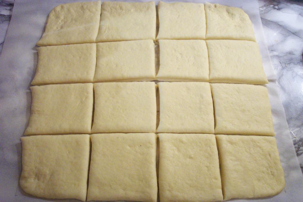 Quando la pasta sarà raddoppiata, pesarla e dividere il peso per 12. Modellare delle palline della stessa grammatura e disporle una accanto all’altra ben unte con burro fuso.