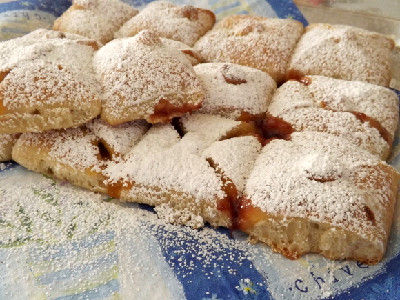 Mettere la confettura al centro di ogni quadrato (ho variato i piaceri alternando confettura di albicocche, di prugne, di composta o un quadrato di cioccolato!!