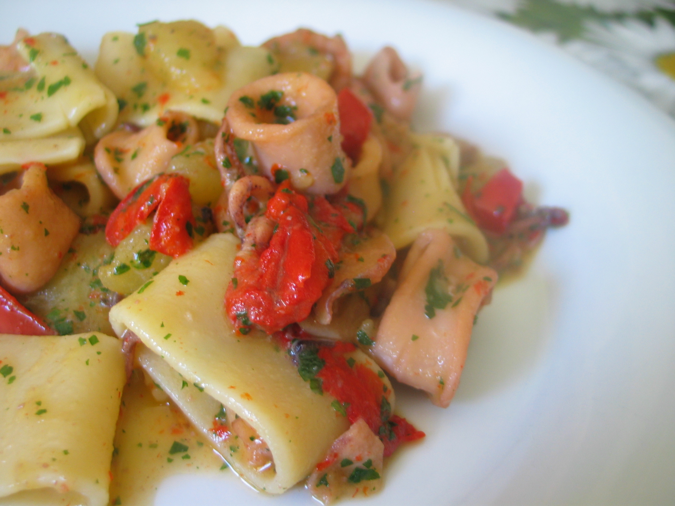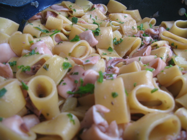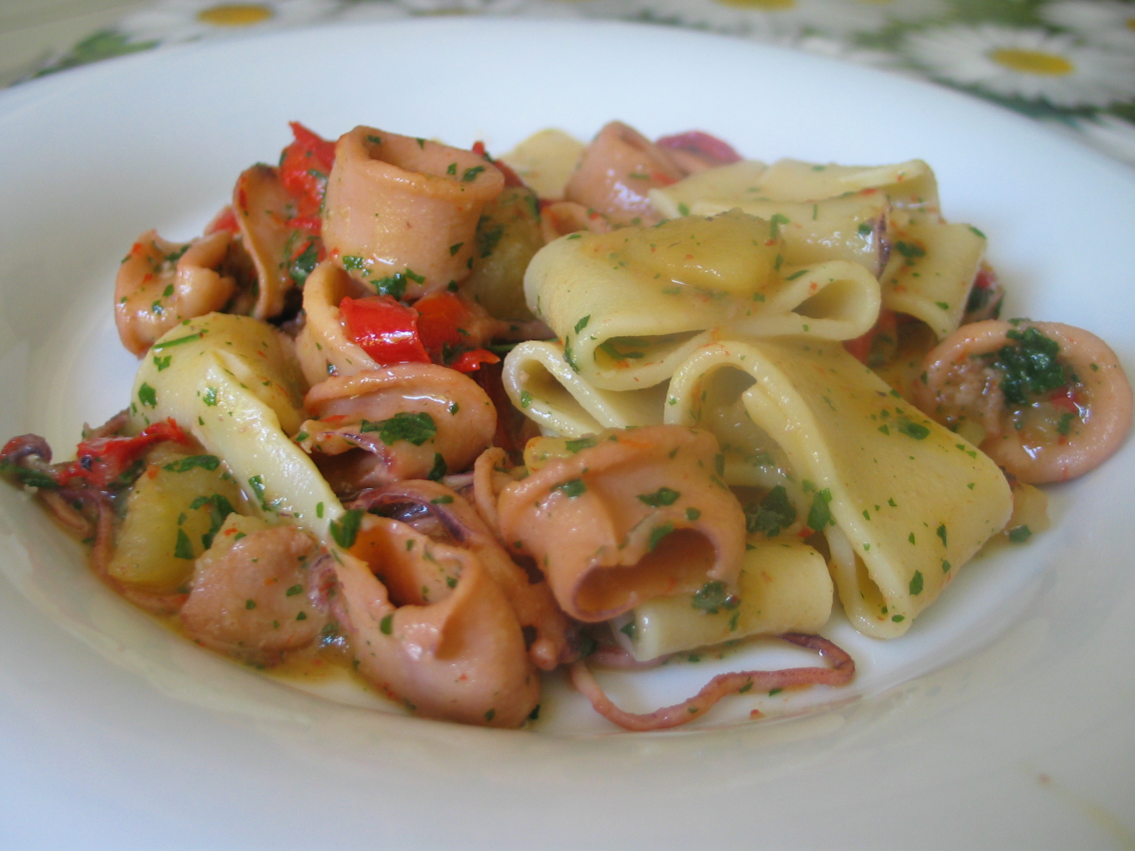 Cuocere la calamarata e condirla col sugo preparato,spadellandola per pochissimi minuti.