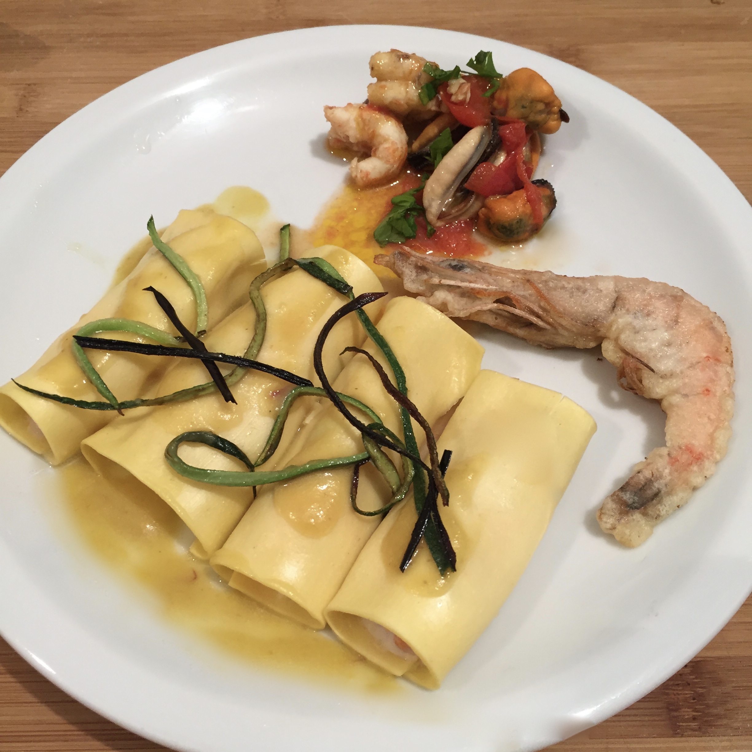 Versare nel piatto un paio di cucchiai di fumetto e poggiarvi i cannellini, ungerli appena col fumetto e poggiare i fili di melanzana e zucchina, in un angolo del piatto 2 cucchiai di gamberi/cozze col sughetto e poco più in là il gambero fritto.