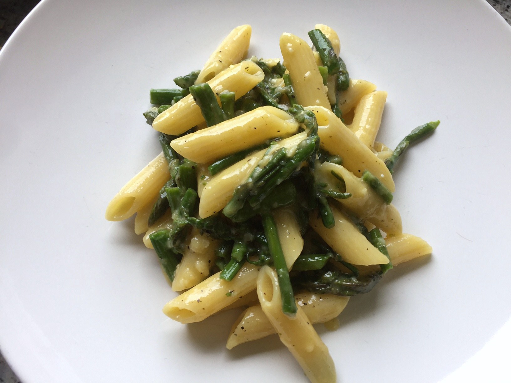 Lessare le penne e intanto preparare l'uovo battuto con parmigiano e pepe abbondante. A cottura ultimata, a fuoco spento, scolare la pasta aggiungere gli asparagi molto caldi e la crema di uova e formaggio e ....girare girare girare per far bene amalgamare il tutto....