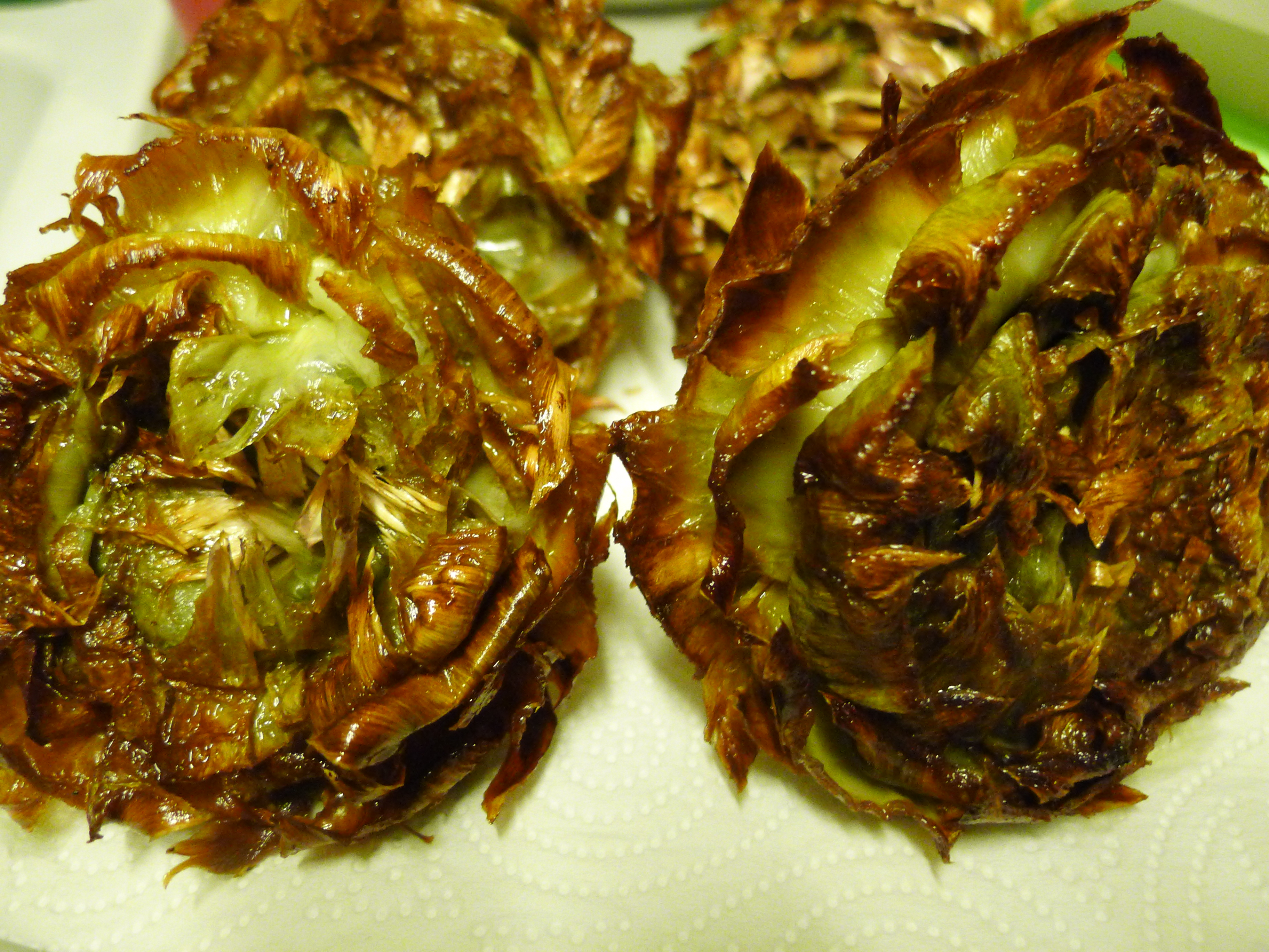 Si ritirano e si fanno scolare con il fiore sotto.Allargare le foglie delicatamente usando una forchetta e aggiungere sale e pepe sul fiore.