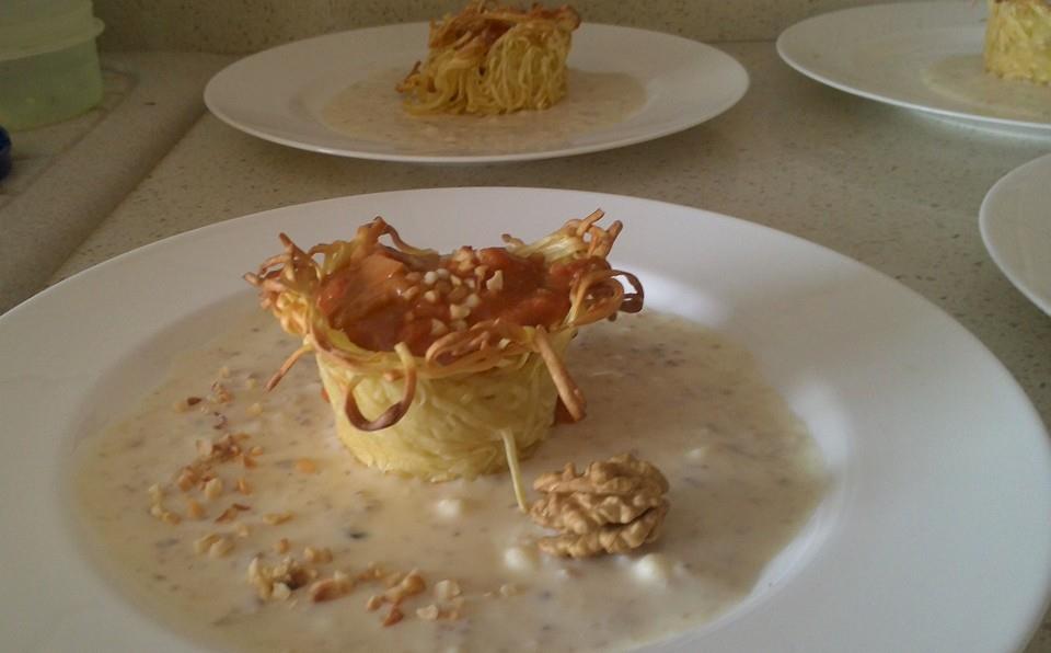 Preparare la pasta fresca con farina e uova e sale, tirare la sfoglia e creare i tagliolini. Cuoceteli in acqua bollente salata al dente, scolateli, aggiungete un po’ di besciamella e fate i cestini come meglio potete: io ho queste idee e possibilità, una foto val più di 1000 parole: