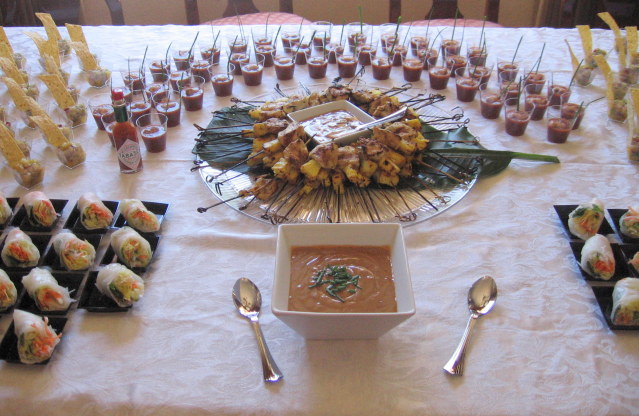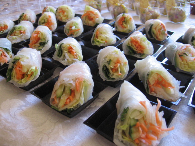 Per questa ricetta, seguite questo link di un mio vecchio post, eliminando la rucola ed usando menta fresca e cilantro fresco. Poi tagliate ogni involtino a meta’ e servite su un piattino quadrato. Serviteli con la stessa salsa agli arachidi usata per il pollo.