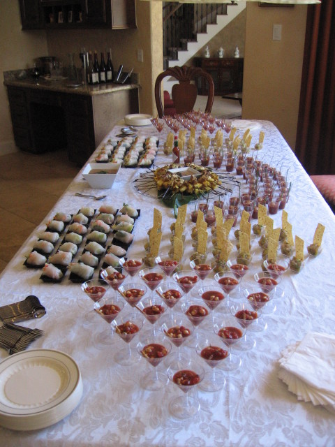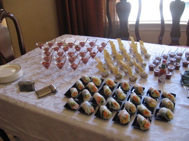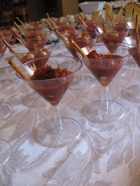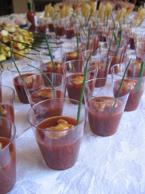 Frullate 2 peperoni rossi arrostiti, 10 pomodori maturi, privati dei semi, 1/2 mazzetto di cilantro fresco, 2 spicchi di aglio, 1/2 cetriolo inglese, il succo di 1 limone, 3 cucchiaini di paprica dolce affumicata (o piu’ se piace) e 2 tazze di succo di pomodoro. Dopo che avrete frullato bene bene il tutto, passatelo attraverso un colino a maglie larghe, in modo da eliminare eventuali pellicine, ma lasciando la polpa intatta e condite il tutto con olio, sale, pepe e aceto di sherry. Fate insaporire per qualche ora, poi riassaggiate e vedete se dovete aggiustare di sale, pepe, olio o aceto! Servire in bicchierini rotondi da 1.5 ounce con un rametto di erba cipollina e un cracker a forma di pesce.