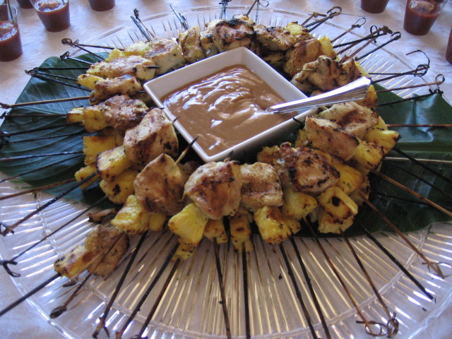 Fate marinare 2 kg di petto di pollo, tagliato a strisce (in lunghezza), in una crema fatta da: 1 tazza di yogurt, zenzero fresco grattuggiato a piacere, aglio grattuggiato a gusto, 1 cucchiaio di curry in polvere, 1 cucchiaio di curcuma (per accentuare il colore) ed 1 lattina di acqua di cocco (o l’acqua da 1 noce di cocco). Fate riposare in frigo un paio di ore. Nel frattempo, mettere degli spiedini di legno a bagno in acqua fredda, cosi’ non brucieranno (troppo) durante la cottura del pollo alla brace. Trascorso il tempo indicato, infilate le strisce di pollo – leggermente scolate dalla salsa - con gli spiedini, come se stesse cucendo. Poi, infilzate su ogni stecchino un pezzetto di ananas, il quale oltre a conferire extra sapore, serve a rendere il pollo piu’ tenero. Grigliate gli spiedini per 3-5 minuti finche’ il pollo sara’ cotto.
