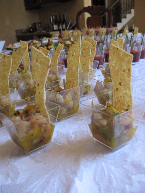 Fate marinare per un paio di ore 1 kg di gamberetti cotti, sgusciati e tagliati a pezzetti, con 1 cipolla rossa a dadini, 2 peperoncini verdi piccanti (jalapeno), il succo e la scorza di 1 lime, il succo di 1 limone, il succo di 2 arance, 2 spicchi di aglio, 3 mango maturi a dadini, 1 mazzetto di cilantro fresco tritato, 1 mazzetto di ravanelli a dadini e un paio di bicchierini di tequila. Servite in bicchierini da 2 ounces, accompagnandoli da una tortilla chip.