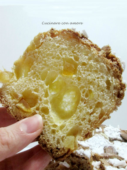 prendere il primo impasto e lasciarlo raffreddare in frigo per una mezz'oretta, in modo da cominciare con un impasto freddo ed evitare che si scaldi troppo e superi i 26° durante la lavorazione con gli altri ingredienti. Usare inoltre ingredienti freddi di frigo, sempre per la stessa ragione. Un impasto freddo fa meno fatica a incordare. Trascorso il riposo in frigo, mettere l'impasto nella ciotola dell'impastatrice, aggiungere la farina e impastare a velocità bassa fino a che la farina si sarà incorporata e l'impasto avrà ritrovato l'incordatura. Ora unire il miele e poi alternare una parte di zucchero e una parte di tuorli, sempre attendendo che l'impasto li abbia incorporati prima di procedere all'inserimento successivo. Quando si avrà finito di incorporare questi ingredienti, aggiungere il sale, poi cominciare a poco a poco con il burro e infine unire gli aromi. Per evitare il surriscaldamento del motore della vostra impastatrice ogni 10 minuti spegnere e riaccendere dopo 3-5 minuti. Durante tutte le operazioni di inserimento degli ingredienti l'impasto non deve mai perdere l'incordatura, quindi non aver fretta nell'inserimento, ma attere sempre che l'impasto ritrovi l'incordatura. A questo punto cominciare a inserire l'acqua, un cucchiaino alla volta e sempre lentamente. Non è necessario inserire tutta l'acqua, perché dipenderà dall'assorbenza della farina che avete usato; non rischiate di smollare troppo l'impasto: fermatevi se vedete che l'impasto non vuole più acqua. ( io l'ho aggiunta tutta gradatamente senza problemi ) Ora prendere l'impasto, pirlarlo,coprirlo a campana con una ciotola capovolta e lasciarlo riposare per 1 ora. Trascorsa 1 ora, pirlare di nuovo e lasciare riposare per 15 minuti all'aria in modo che si formi una sorta di pellicina più asciutta in superficie. Pesare 900 g di impasto (normalmente la quantità di impasto è più alta perchè se ne perde un po' durante la lavorazione, ma se dovesse comunque avanzarne al limite fateci un apnettoncino da 1 etto. Nella colomba si mettono 900 g di impasto a differenza del panettone in cui invece si aggiunge un 10% al kg perchè si tiene conto del peso della glassa). Dividere ora l'impasto in due e formare due cordoni stringendo bene quando li formate in modo che l'impasto sia abbastanza tirato. Riporre il primo cordone nello stampo da colomba a formare le ali. Disporlo a "U" (una "U" dalla base larga ovviamente quanto il corpo della colomba) in modo che tagli la colomba a metà e copra anche le ali. Il secondo cordone dovrà essere più assottigliato da un lato, un po' meno dall'altro, ma un po' più largo al centro e lungo quanto la lunghezza della colomba all'incirca. Disponete il secondo cordone a croce sopra quello delle ali. La parte più larga dovrà risultare in corrispondenza del cordone delle ali e quella più assottigliata in corrispondenza della testa della colomba. Coprire la colomba con della pellicola e porla a lievitare a 28° finché mancheranno 2 cm dal bordo laterale (circa 4-6 ore).