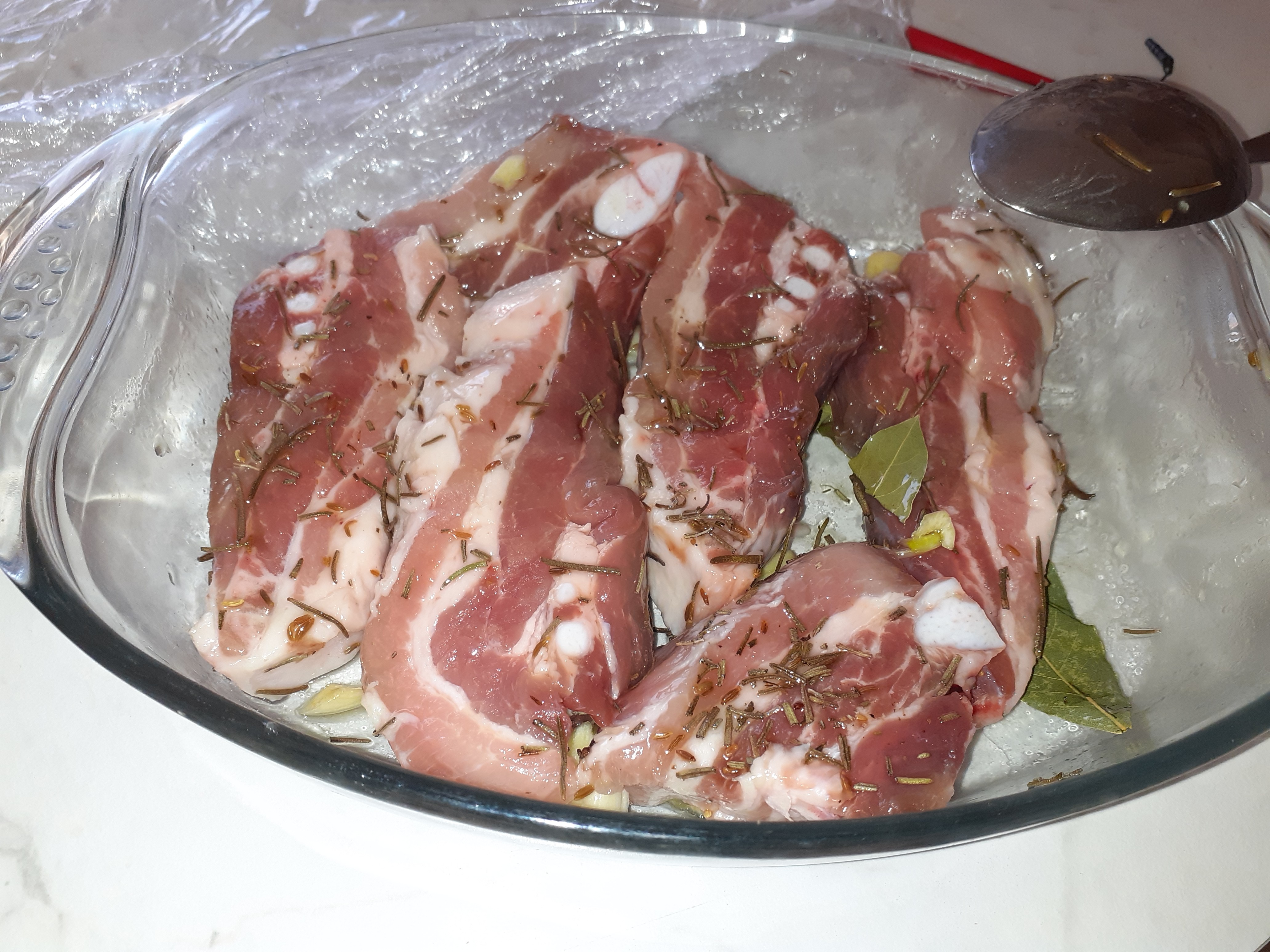 16 costine di maiale - basilico – rosmarino – prezzemolo – salvia – pinoli (i miei liguri) – origano – timo – alloro - peperoncino – vino rosso - olio evo– sale – pepe.