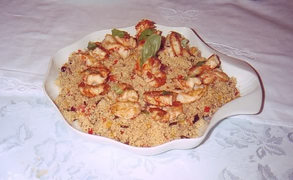 Disporre il cous cous in una insalatiera, aggiungere i gamberi, condirli con un filo d’olio extravergine e aceto balsamico, decorando con foglie di basilico o mentuccia