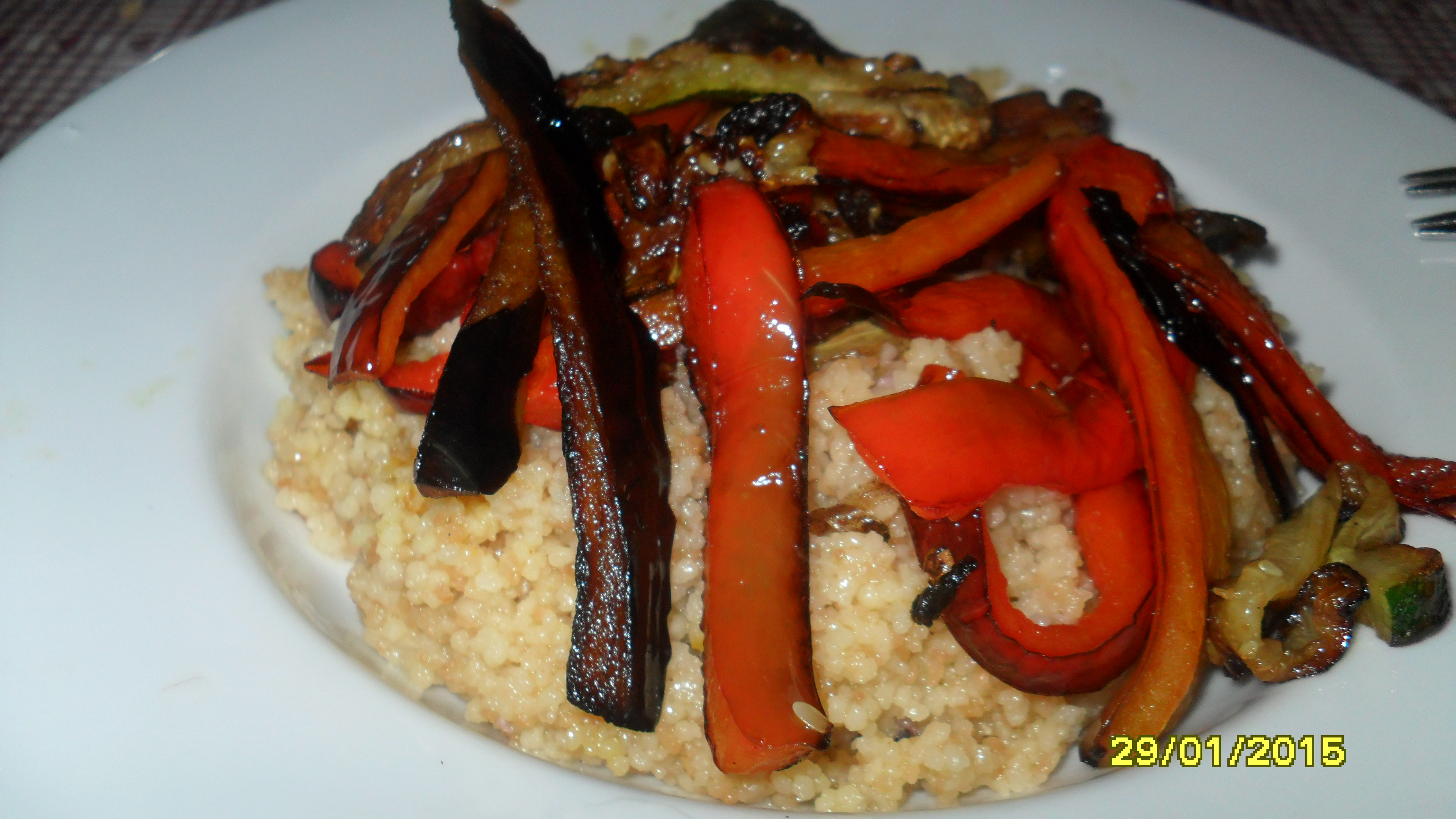 In una padella, tostare il couscous, maneggiandolo fino a che non si colori e inizi a profumare di pane appena sfornato. Spegnere la fiamma, versare il brodo di pesce, fino a coprirlo del tutto, e lasciare riposare per una decina di minuti circa - coperto con pellicola - controllare se va bene, diversamente sempre con la pellicola 2 minuti nel MO - aggiungere mezzo cucchiaio di olio e sgranare con una forchetta, se occorre aggiungere ancora un poco di olio.