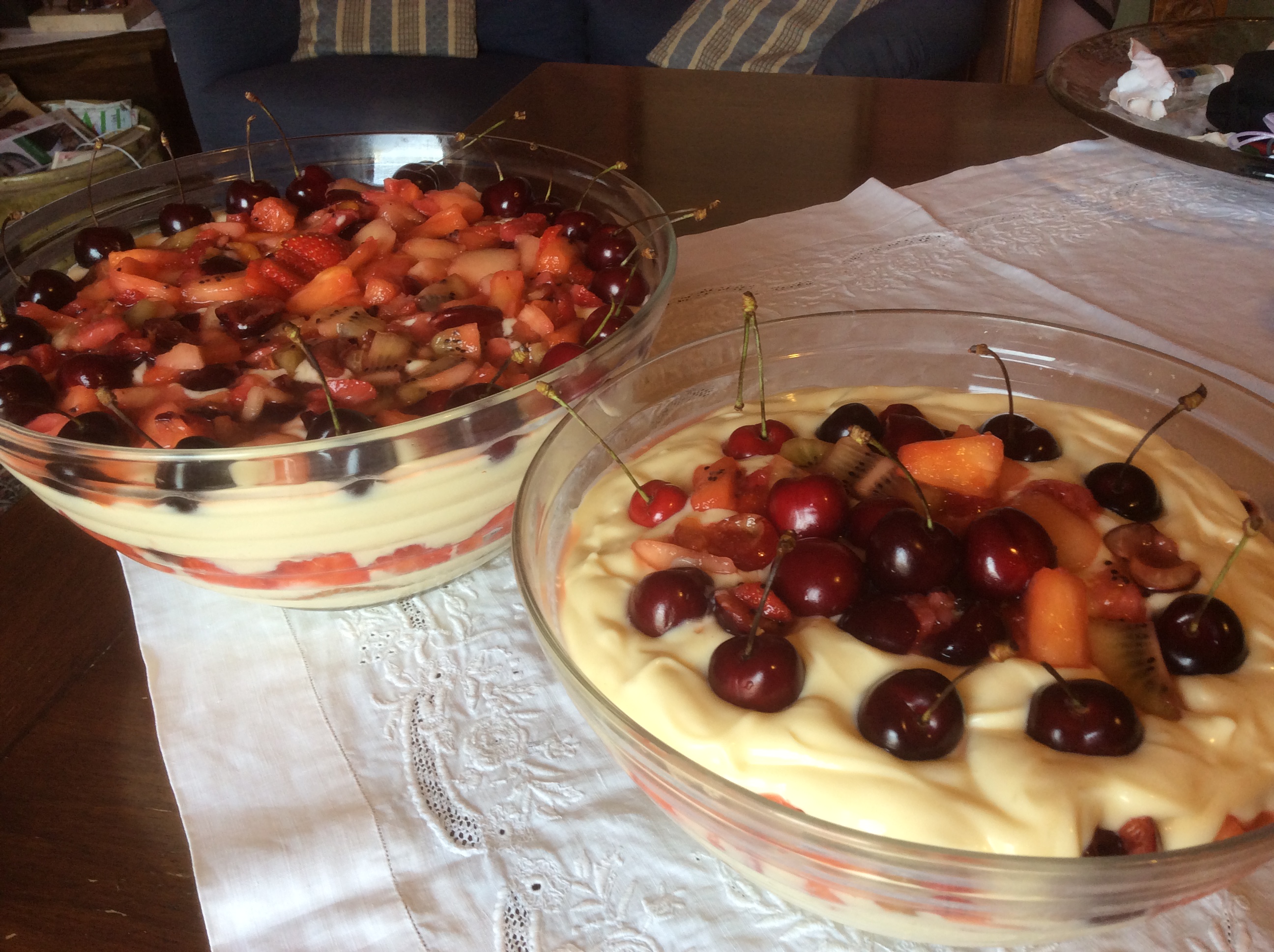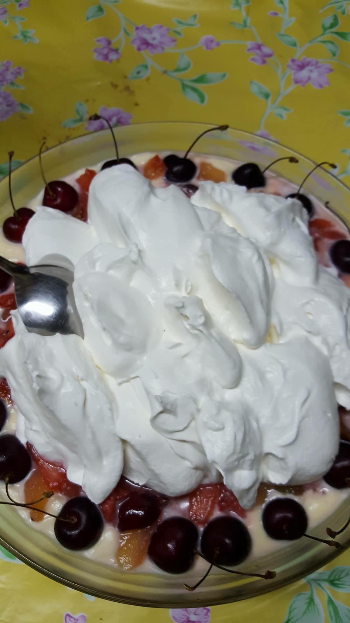 - In una coppa di vetro, stendere uno strato di crema, poi uno di pan di Spagna, bagnare con lo sciroppo della frutta e aggiungere uno strato di frutta. Ripetere gli strati fino a esaurimento degli ingredienti.