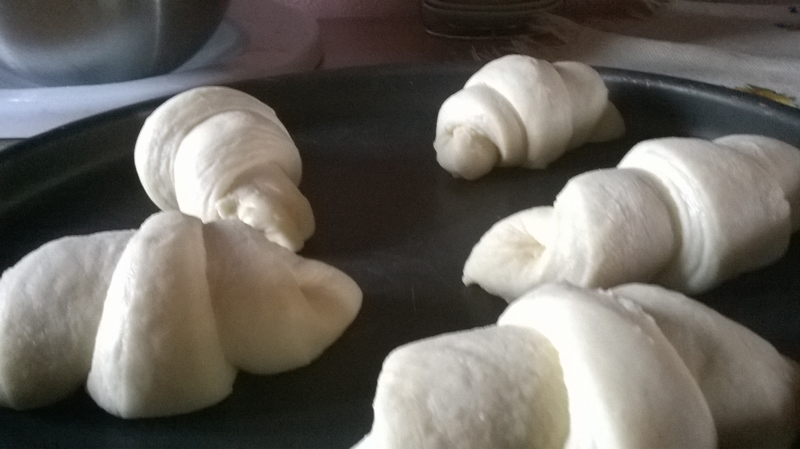 Schiacciare la punta come nella foto per evitare che scivolino nell’arricciarli e per facilitarne la chiusura. Arrotolare i croissant formando il classico cornetto e mettete sulla teglia.