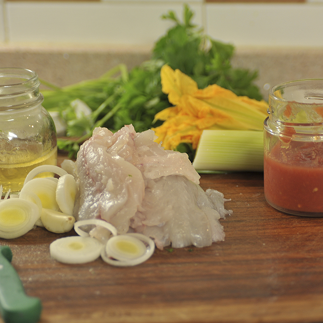 2) Sfiletto, o faccio sfilettare dal pescivendolo, il pesce: in questo caso 2 filetti di un'un'orata e un filetto di scorfano. Dell'orata ho portato a casa lisca e testa che mi serve per il brodo di pesce; in genere lo congelo per usi futuri. Faccio stufare in padella qualche rondella di porro e uno spicchio di aglio, aggiungo un po' di passata, i filetti di pesce tagliati a dadi, un pizzico di sale, il vino che avevo fatto sfumare in precedenza, poi quando il ragout è quasi pronto un cucchiaino di prezzemolo e, nel caso siano ancora disponibili, qualche fiore di zucca tagliato a striscioline; per ultimo tolgo lo spicchio di aglio e giro un filo d'olio al momento di spegnere il fuoco