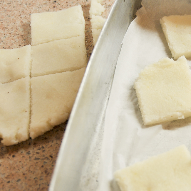1) Preparo la polenta, con il pesce preferisco quella bianca, la stendo uniformemente alta circa uno o due centimetri in una teglia rivestita di carta forno unta, la rosolo in forno e ricavo crostini. In alternativa stendo la polenta su un piano leggermente unto, ricavo i crostini e li rosolo sulla piastra. Mi aiuto a spianare la polenta con una paletta di silicone.