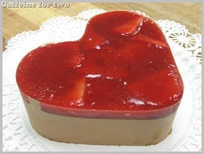 Su una placca rivestita di carta da forno, appoggiatevi un anello di acciaio e all'interno rivestitelo con una striscia di acetato. Versatevi la mousse fino ai 3/4 di altezza dell'anello di acciaio. Livellate bene. Con un cucchiaio ricoprite la mousse con uno strato di gelatina e fate raffreddare in frigo finche' la gelatina si solidifica. nel frattempo tagliate le fragole fresche a fette sottili. Mettete uno strato sottile di fragole sullo strato di gelatina rappresa e ricoprite con altra gelatina fino a raggiungere completamente il bordo dell'anello di acciaio.