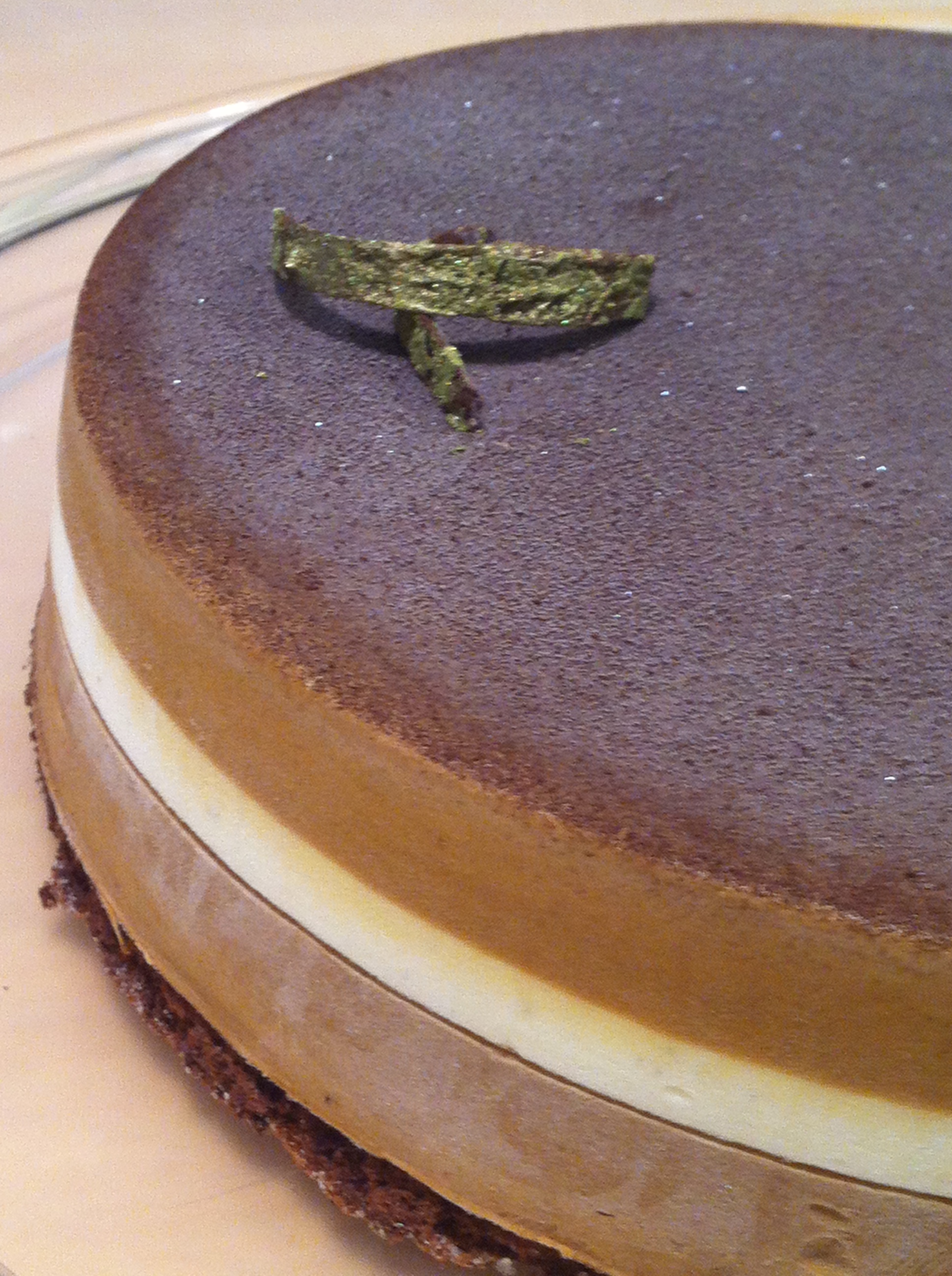 scusatemi per la foto ..la stavo decorando e la foto finale non l'ho fatta. Avevo il velluto spray bianco e non andava bene, le sfoglie di cioccolato non dovevano appesantire la torta, quindi le ho messe solo negli angoli ..negli spazi (fra le sfoglie) ho messo caffè in granelli (prima di portare la torta in tavola) ; sopra l'ho lasciata così perchè la cioccolata lucida e liscia fa il suo effetto.