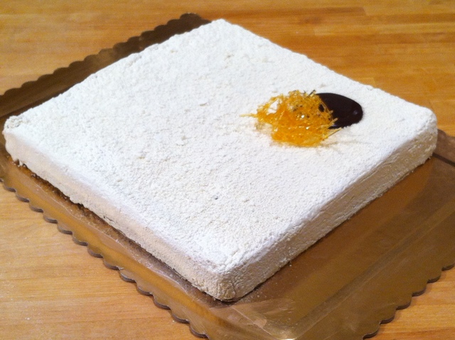 Estrarre la teglia dal forno. Rovesciare il biscotto su un foglio di carta da forno leggermente spolverizzato di zucchero semolato. Ritagliare con una fascia un quadrato di 24 cm di lato. Sistemare la fascia in metallo di 24 cm di diametro su un vassoio ricoperto da acetato. Inserire sui bordi una striscia di acetato. Adagiare sul fondo il disco di biscotto e tenere da parte.