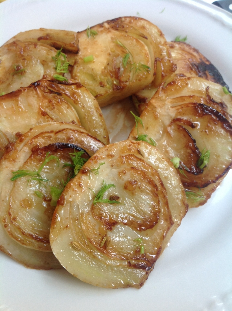 Poi ho aggiunto al fondo di cottura dei semi di finocchio e una cucchiaiata di zucchero e sale. Quando ha preso a caramellare ho rimesso in padella le fette di finocchio perche' si rivestissero di caramello e si ammorbidissero ancora un po'. Andrebbe anche uno spicchietto d'aglio schiacciato, per chi gradisce. E, a questo punto, io ho aggiunto la buccia di limone confit tritata, dato ancora qualche giratina e basta. Ho solo guarnito nel piatto con la barba di finocchio tritata. L'avessi avuto, avrei picchiettato i finocchi con dei pezzettini di caprino e l'aneto ci sarebbe stato moooolto bene.