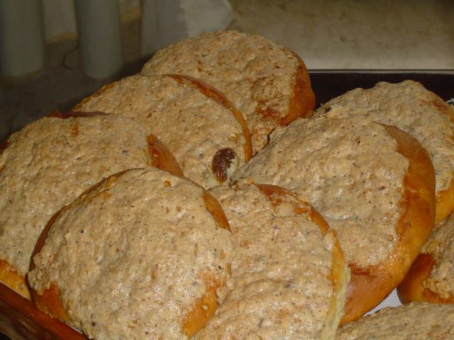 Lasciate riposare 60/70 minuti quindi dividete in pezzi del peso desiderato. Arrotondateli e dopo circa 30 minuti appiattiteli con il mattarello e deponeteli in stampi rotondi del diametro di 10 cm.(io non avevo stampi) A metà lievitazione pennellateli con un preparato a base di uovo, latte e un pizzico di sale. Stendete con il sac à poche la copertura precedentemente preparata e portare a termine la lievitazione (il volume deve quasi raddoppiare). Cuocete in forno a temperatura moderata per circa 20 minuti.