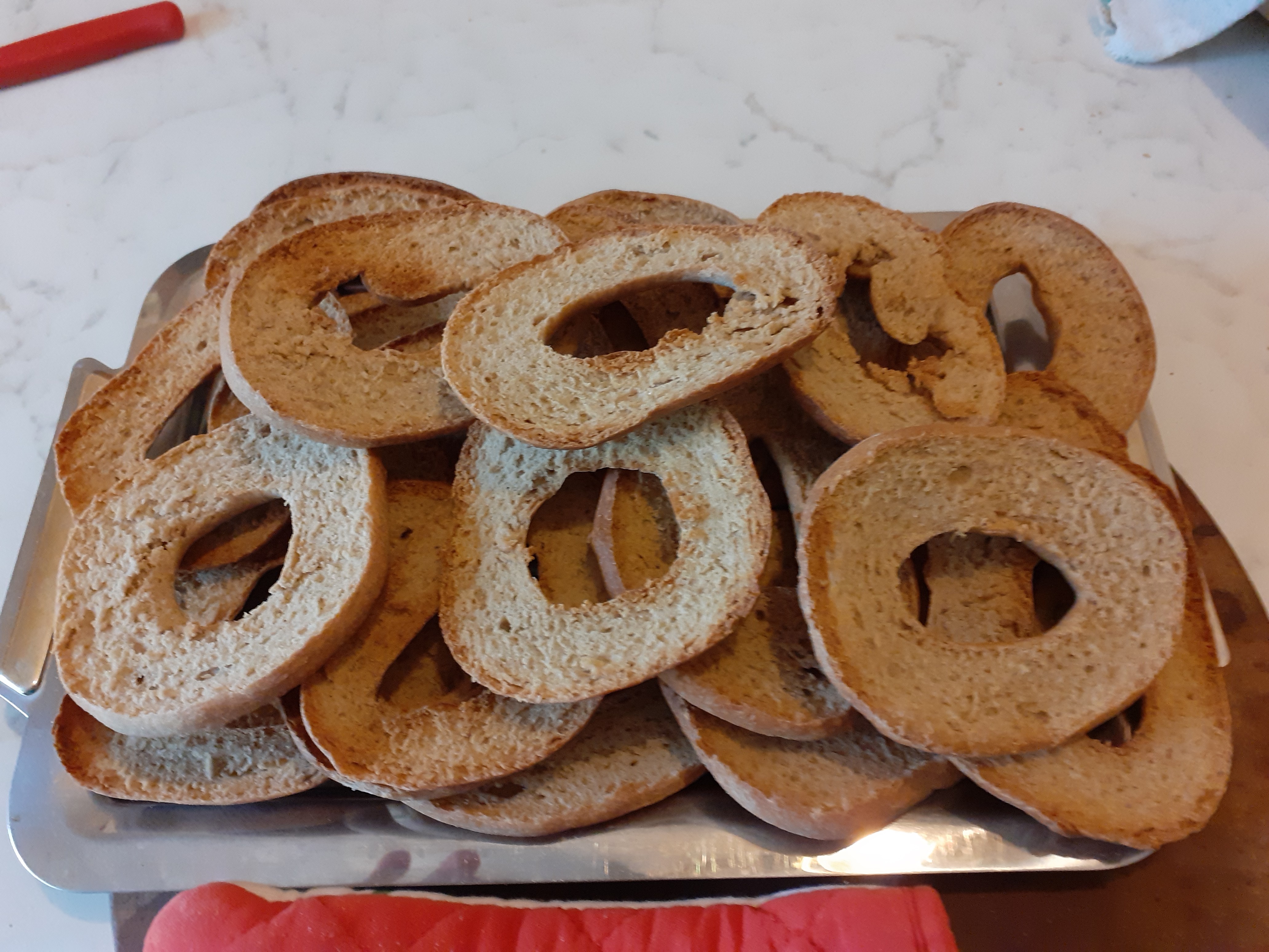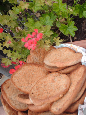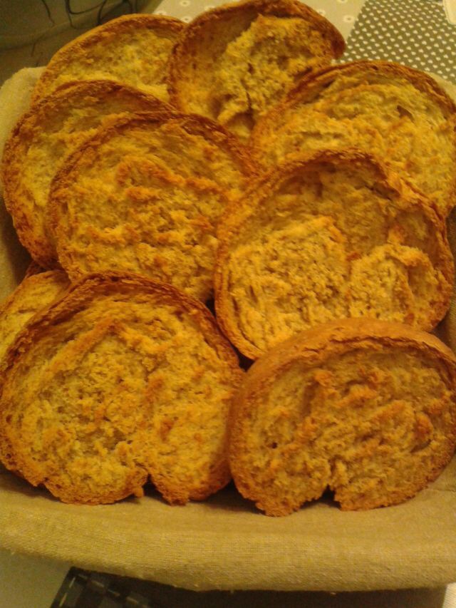 5) tolgo, taglio in longitudinale, e metto di nuovo in forno per altri 10 minuti finche' non bruschettano.