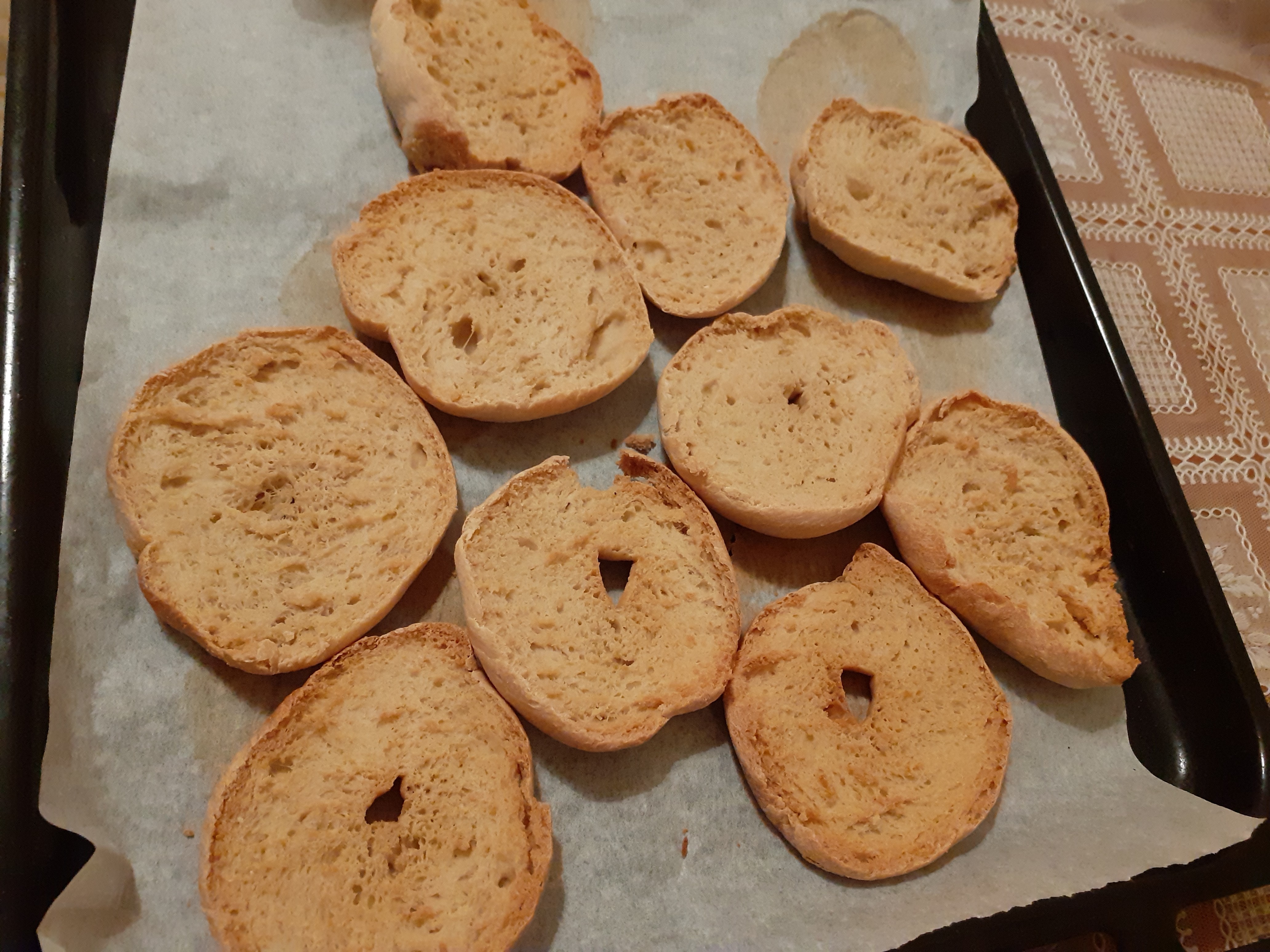 Con un coltello a sega tagliate a metà ogni panino nel senso orizzontale e disponete tutte le metà di nuovo sulla teglia da forno. Infornate per 35 - 40 minuti a 160° in modalità ventilata per asciugarle per bene e biscottarle. Una volta terminata la seconda cottura spegnete il forno e aprite leggermente la porta. Fate intiepidire le friselle nel forno e quando a temperatura ambiente potete conservarle in un sacchetto di carta da pane.