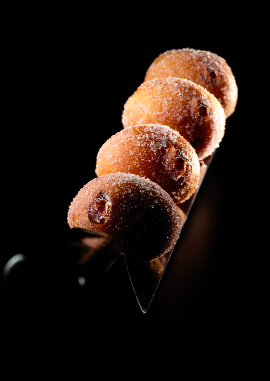 Lavorare a bassa velocità per non rompere l’uvetta e disperderla omogeneamente. Fare raddoppiare il volume della pasta, formare poi formare con un sac a poche con bocchetta liscia delle palline di pasta del peso di circa g 10, tagliandole con un coltello sulla bocchetta. Cuocerle in olio di girasole a 176°C. Quando sono ancora calde spolverarle con zucchero velo vanigliato.