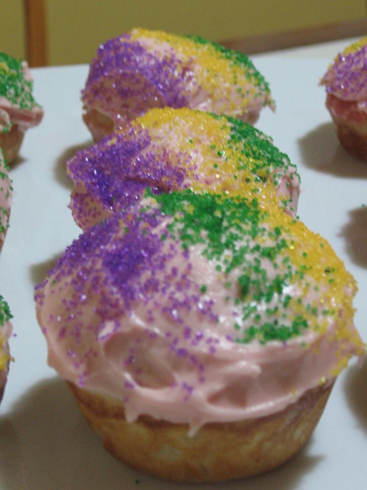 Nota: per la versione cupcake, fare delle mini porzioni da infornare in pirottini e poi glassare con un frosting al cream chese con i colori del mardi gras