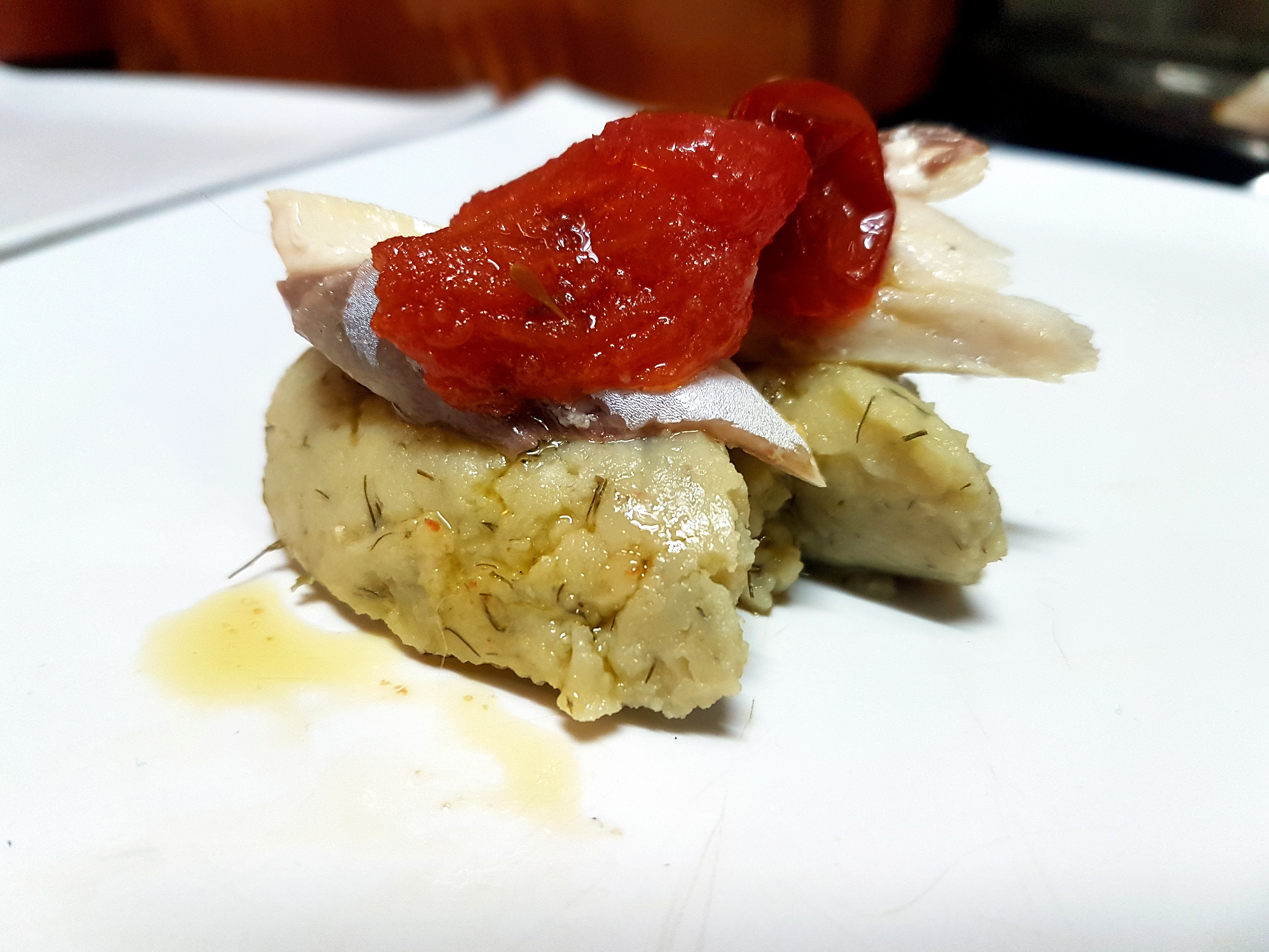 Impiattate preparando una quenelle di macco di fave, sopra ponete il filetto di lampuga, infine il petalo di pomodoro confit.