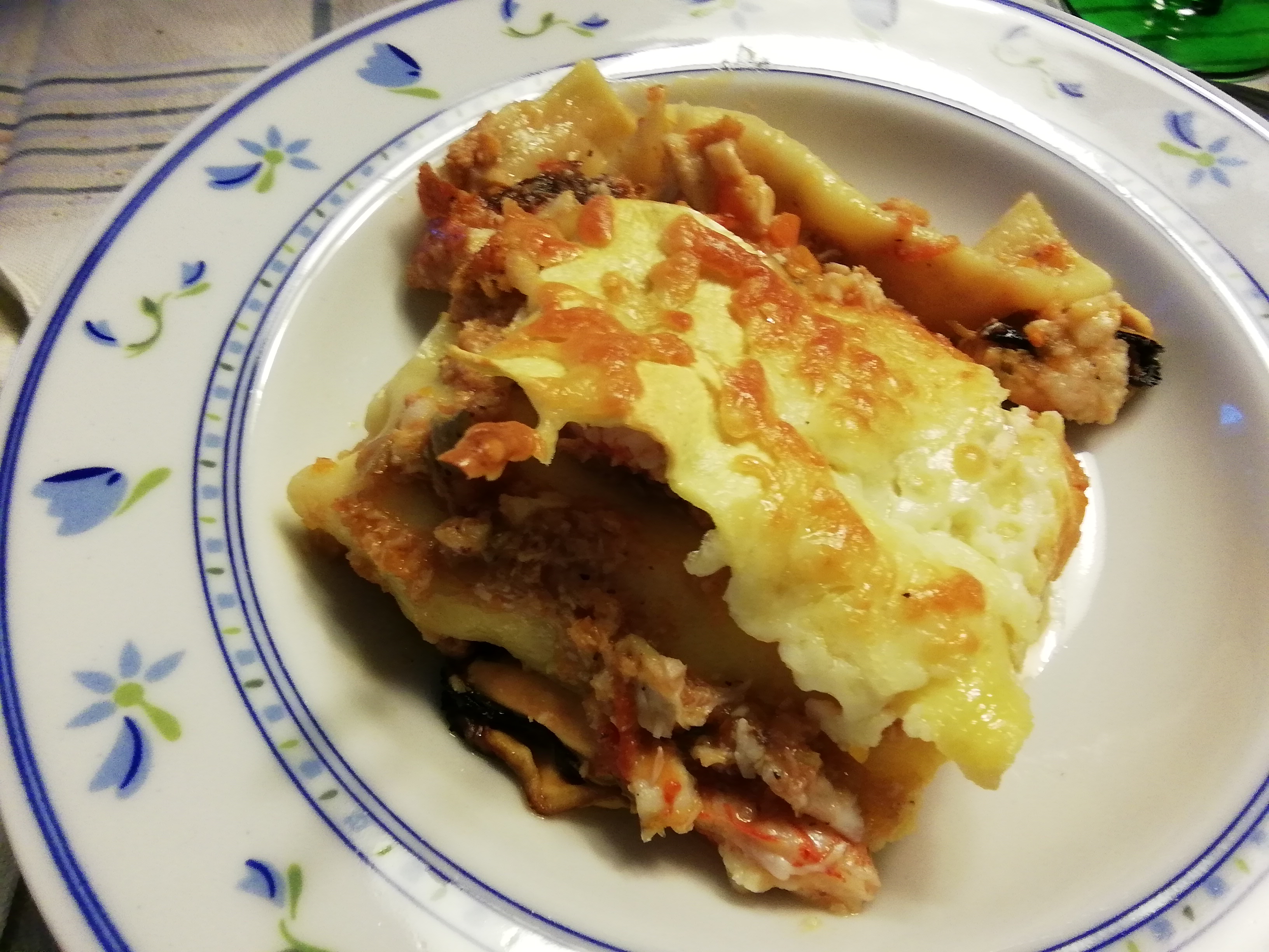 Lasagne di mare Ingredienti: dose per 6/8 persone 8 fogli di pasta per lasagne rustiche Rana Un grosso polpo Una grossa seppia bianca, circa 1,200 kg. Una bistecca di pesce spada 6 filetti di branzino 10 gamberoni Un sacchetto di cozze di Taranto Una scatola di pomodoro a pezzetti 3 cm di pasta di acciughe Mozzarella ben asciutta, da pizza Vino bianco secco 2 foglie di alloro - 6 grani di pepe nero - sedano, carota, cipolla tritatissimi - agli - sale - pepe.