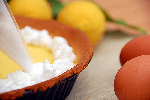 - Per una presentazione più scenografica, montare un albume a neve fermissima con un pizzico di sale e qualche goccia di limone. Distribuire il composto sulla superficie della torta fredda usando una sac-à-poche, coprendo tutta la superficie.