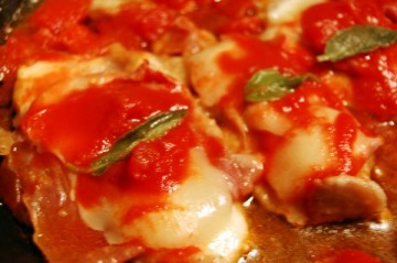 Aggiungete il fondo di cottura e ponete in forno a 180° per 7-8 minuti o finche’ il formaggio non si sara’ squagliato
