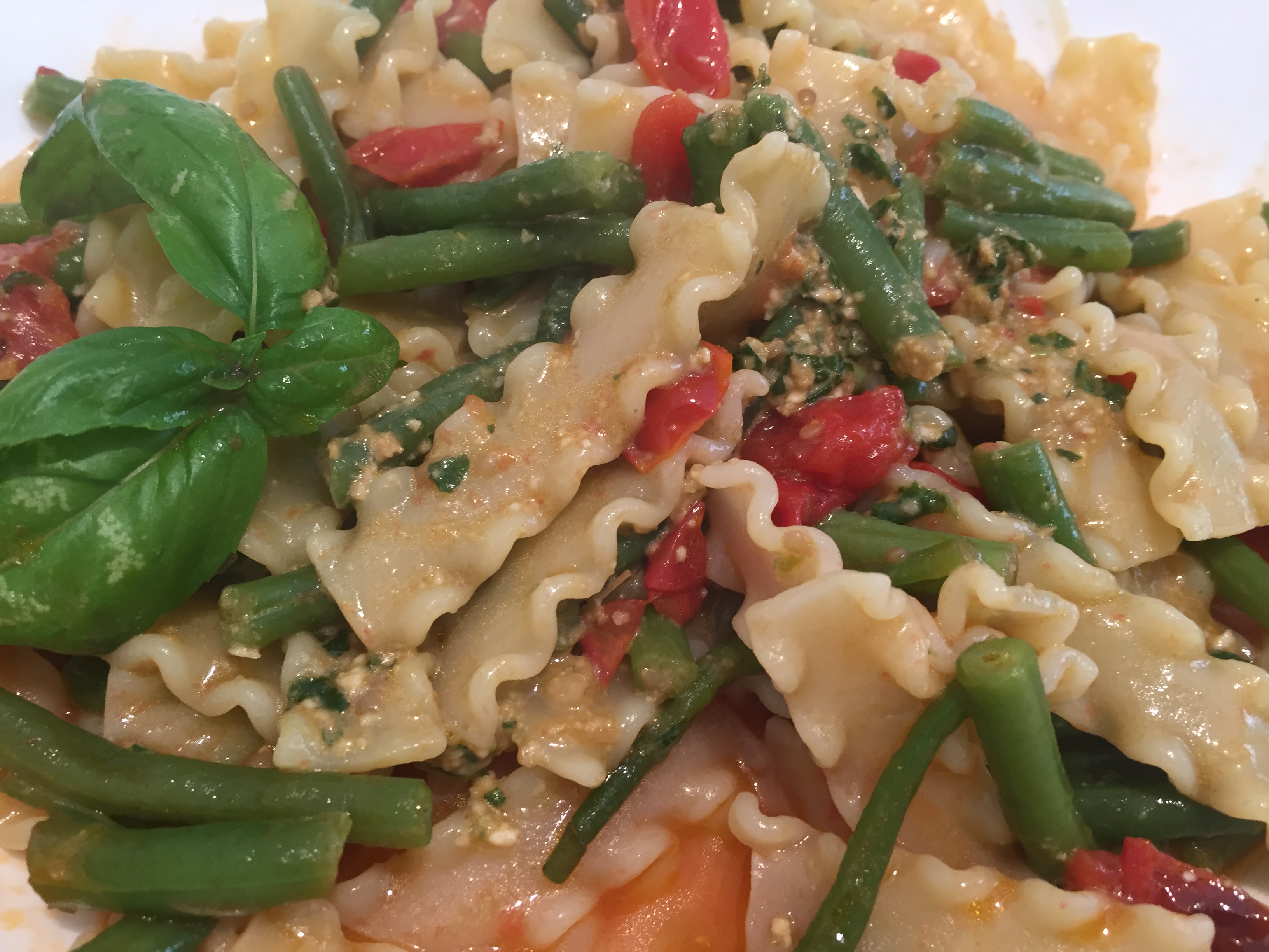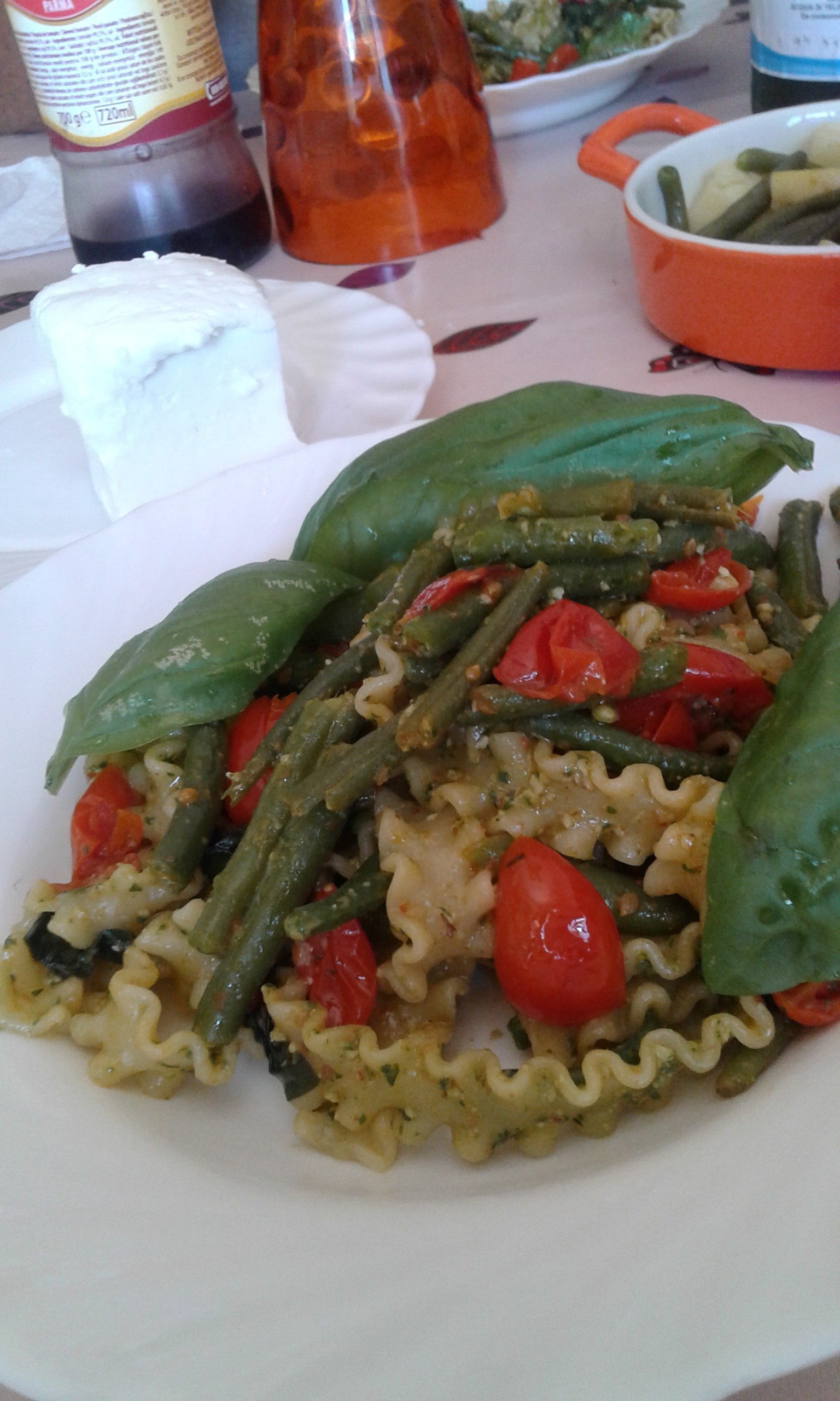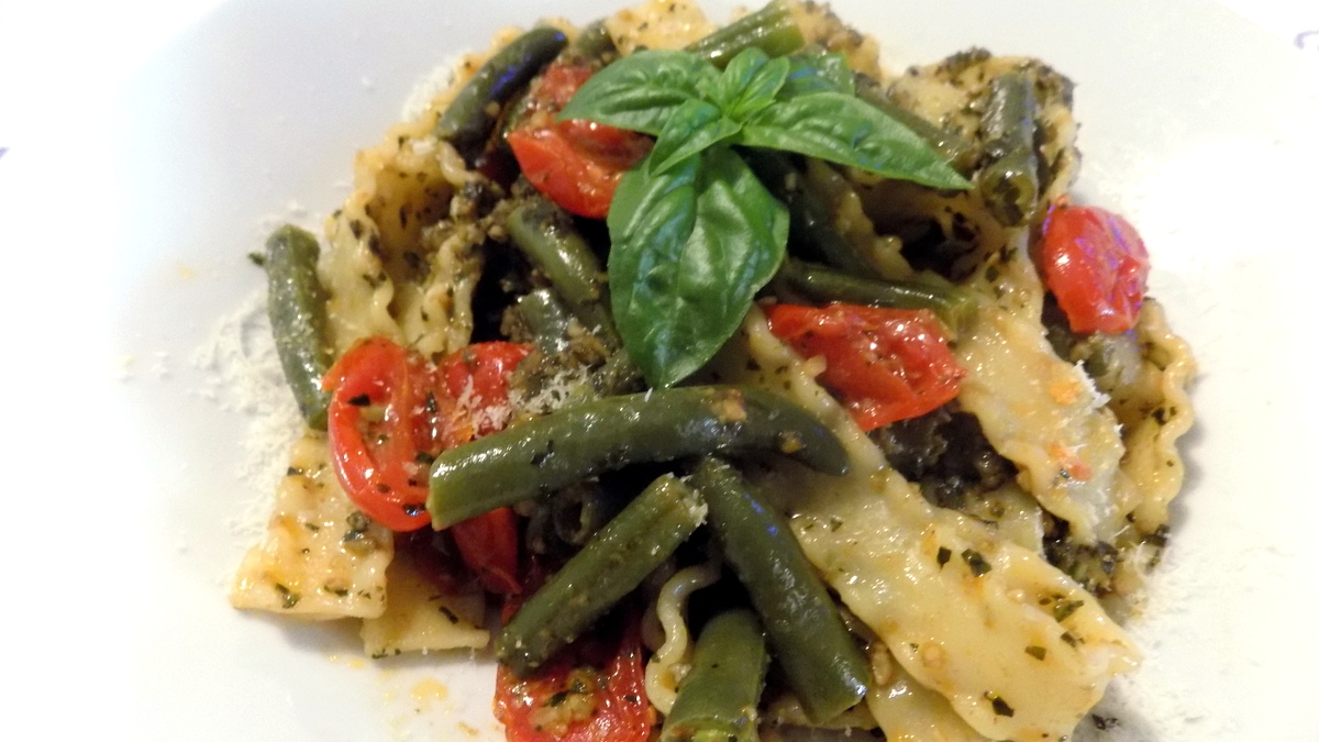 in mixer versare i tre ingredienti per il pesto con un piccolo mestolo di acqua di cottura dei fagiolini lessati e tagliati a pezzetti di 4 cm..Nella stessa acqua (con aggiunta di altra) cuocere la pasta al dente.