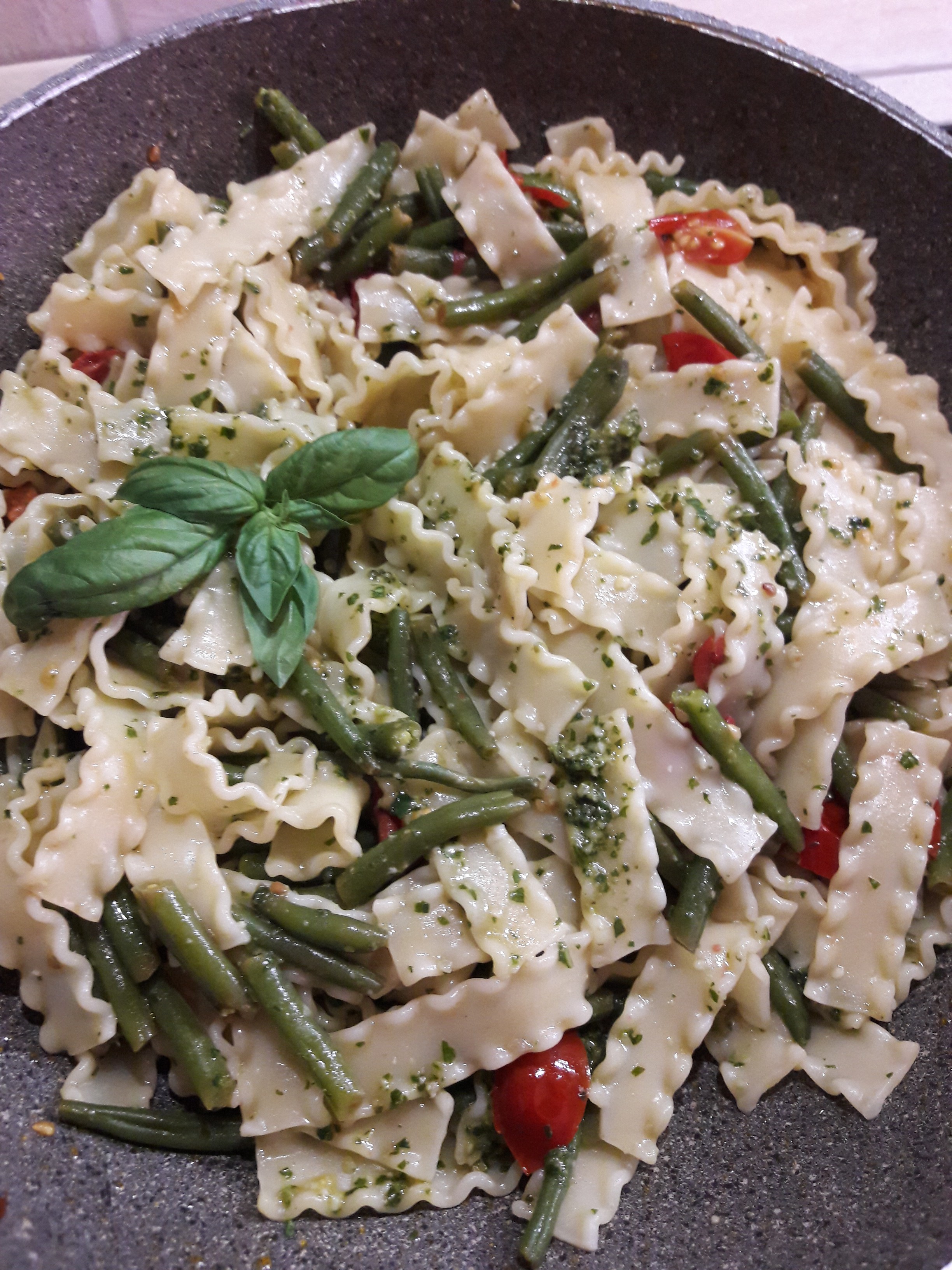 In tegame largo velocemente versare la pasta ed il sugo qualche cucchiaio di pesto .