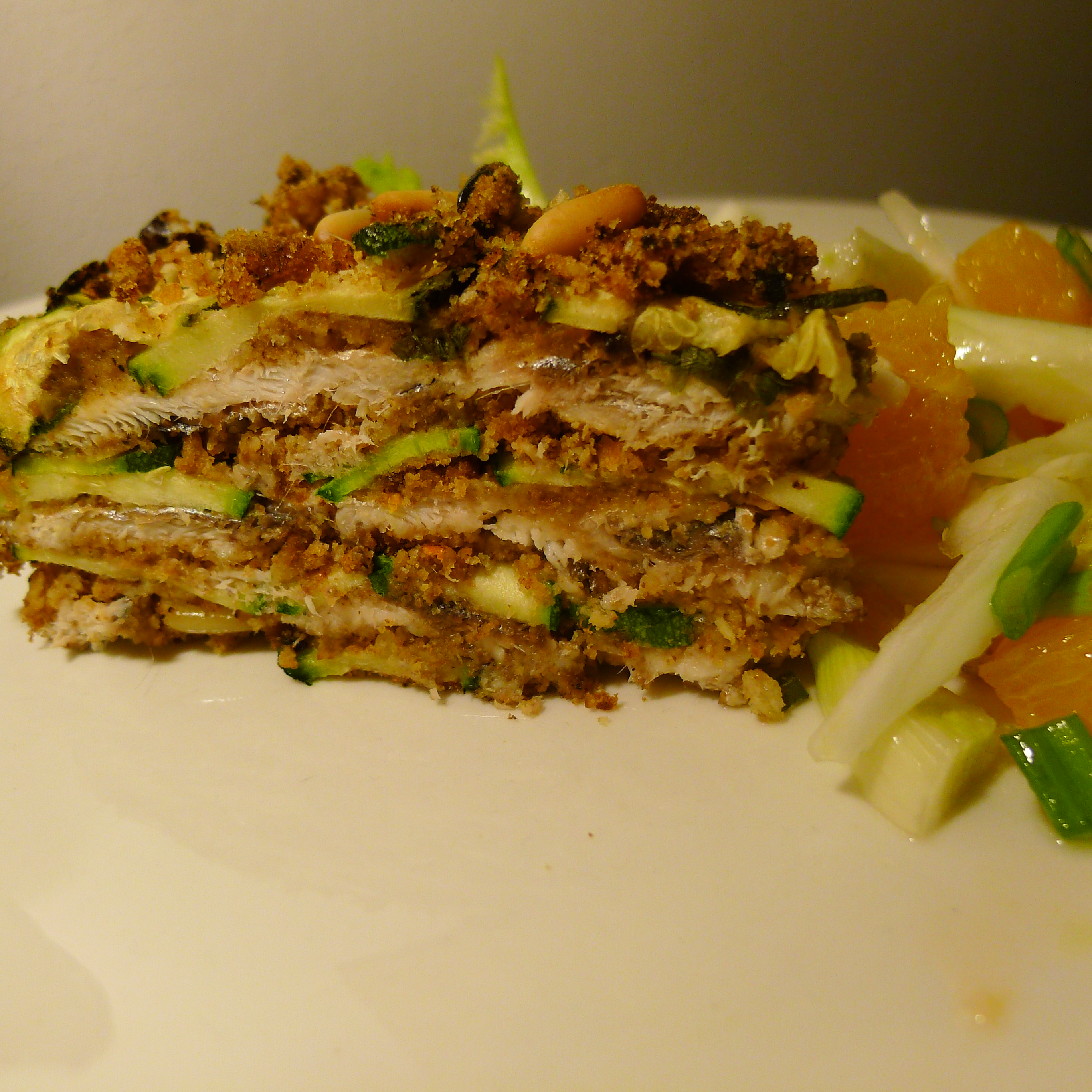 Ungere di olio la teglia, ripulire l'eccesso con un foglio di scottex, e spolverare di pangrattato. Iniziare con uno strato di rondelle di zucchina (e chudere gli strati con la zucchina) alternando con i filetti di alici e ad ogni strato spolverare con il pangrattato "atturrato". 1 cucchiaio di olio finale.