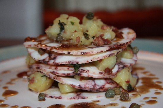 Componete il piatto, formando via via gli strati di polpo e patate ,unendo una cucchiaiata di salsa per ogni strato.
