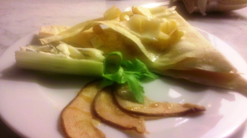 Tagliare, tre strati di pasta fillo sovrapposti, in triangoli da mettere su di una placca foderata di carta forno e spennelarli con il burro (io con olio). Cuocere a 180° per 5/6 minuti. Nel frattempo, tagliare le pere a dadini e farle in padella con il vino e il burro.(per circa 5 minuti senza far spappolare le pere