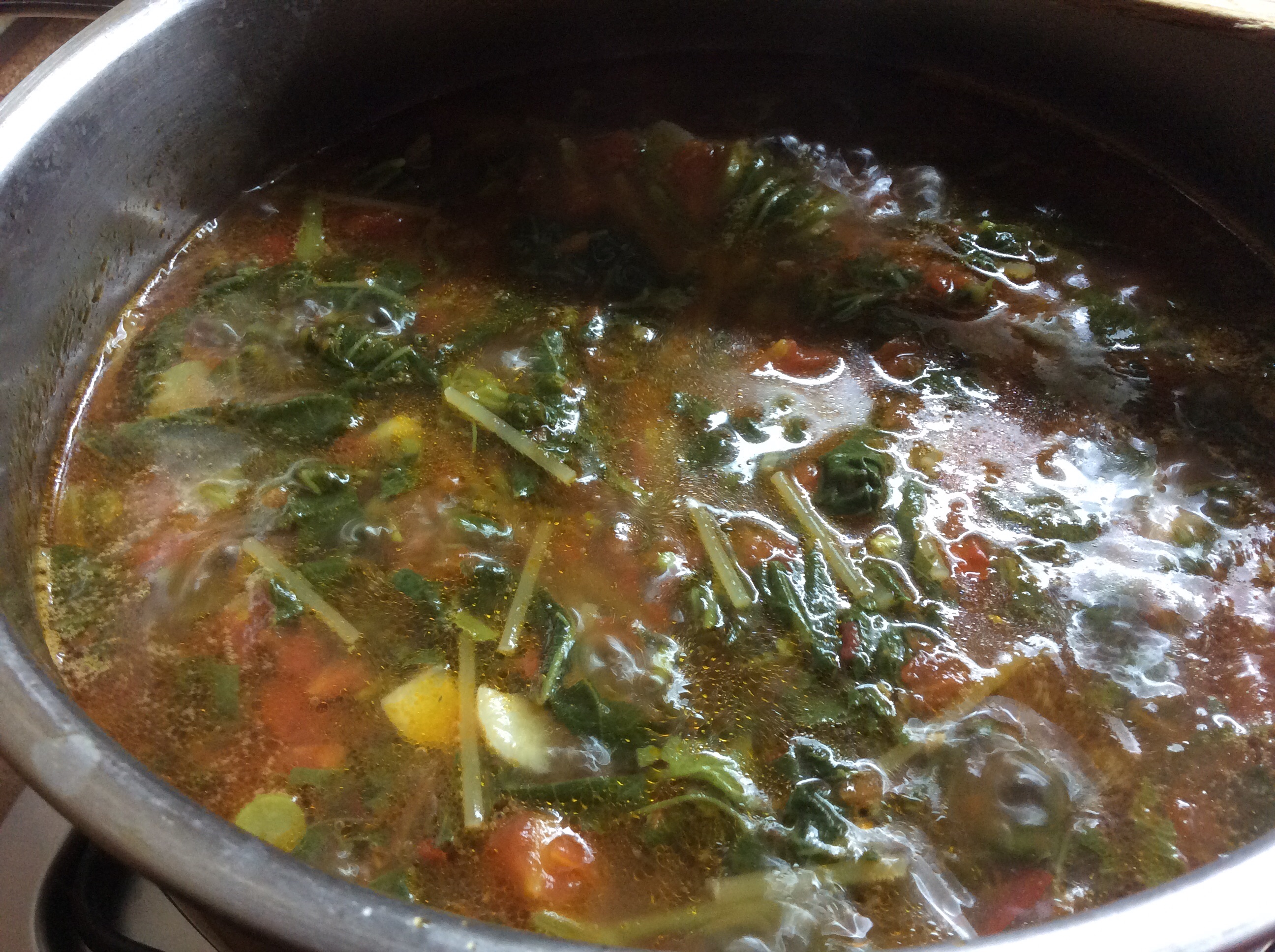 Nell'acqua di cottura delle verdure cuocete gli spaghetti tagliati o i taglierini, qui si va a gusto, , appena la pasta sarà al dente con la schiumarola scolateli e aggiungeteli nella casseruola di coccio dove ci sono le verdure, tiratela ancora un pò sul fuoco, spegnete e lasciatela riposare.
