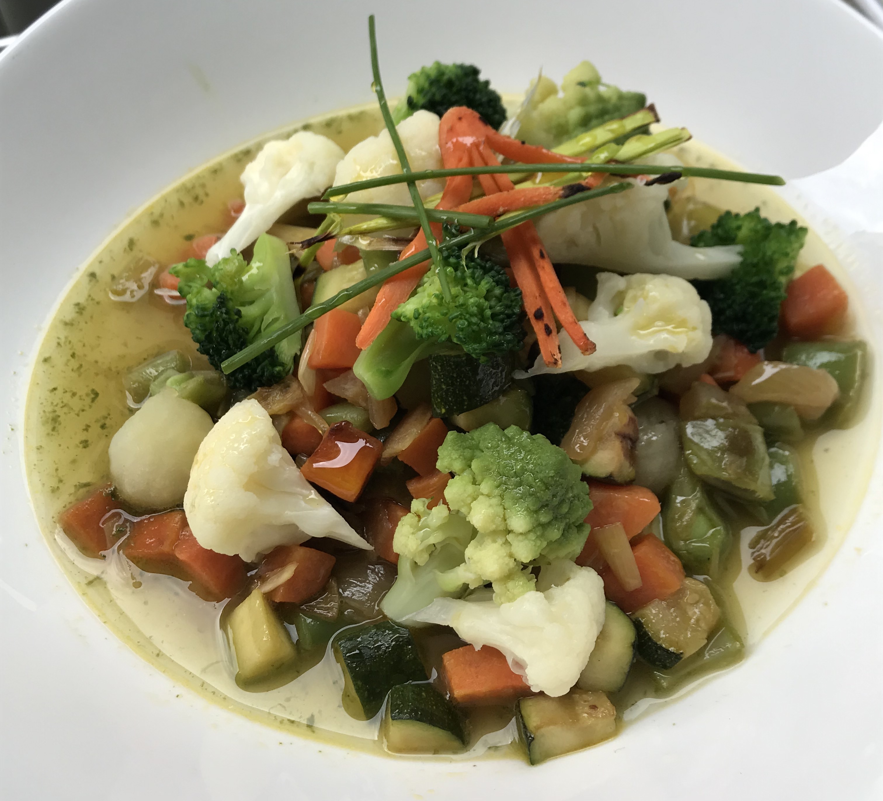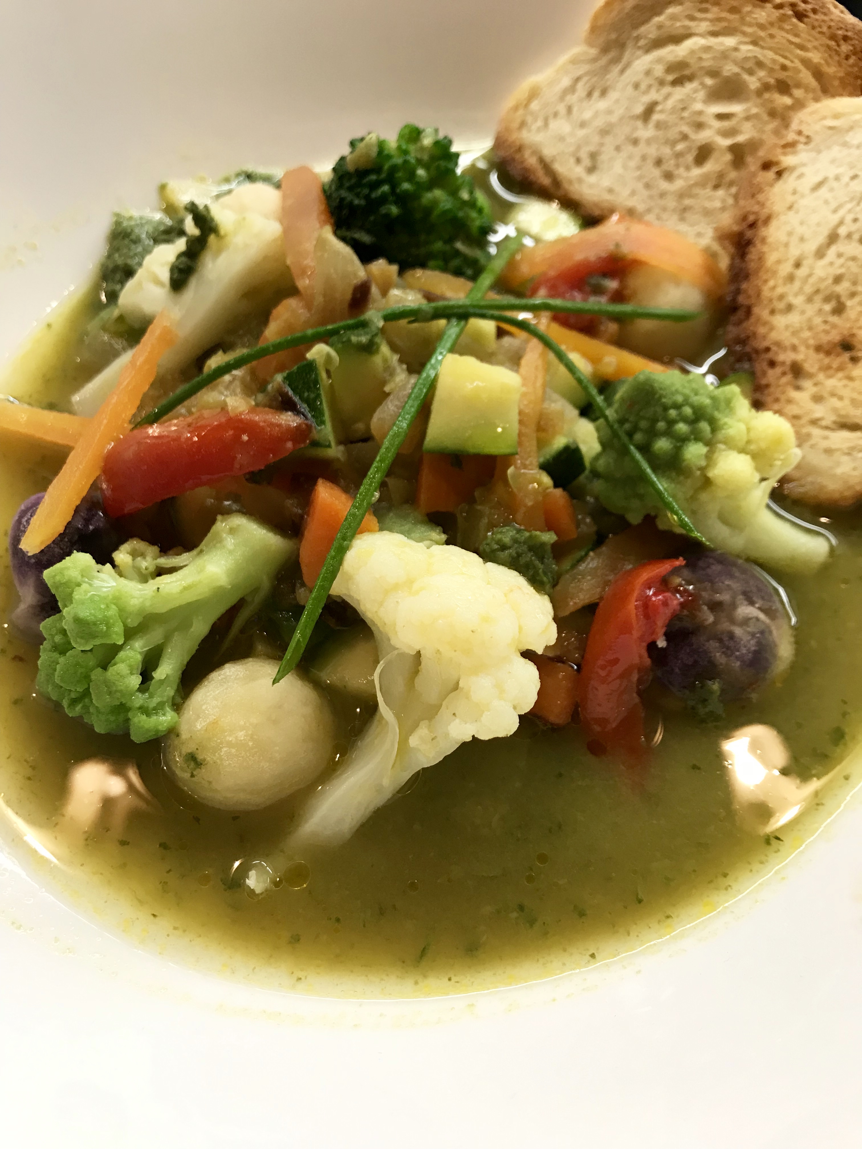 Si parte da un soffritto di olio lardo cipolla sedano basilico tritati grossi, si appassiscono tutte le verdure a disposizione a cubetti, si copre di acqua calda e si cuoce a lungo.